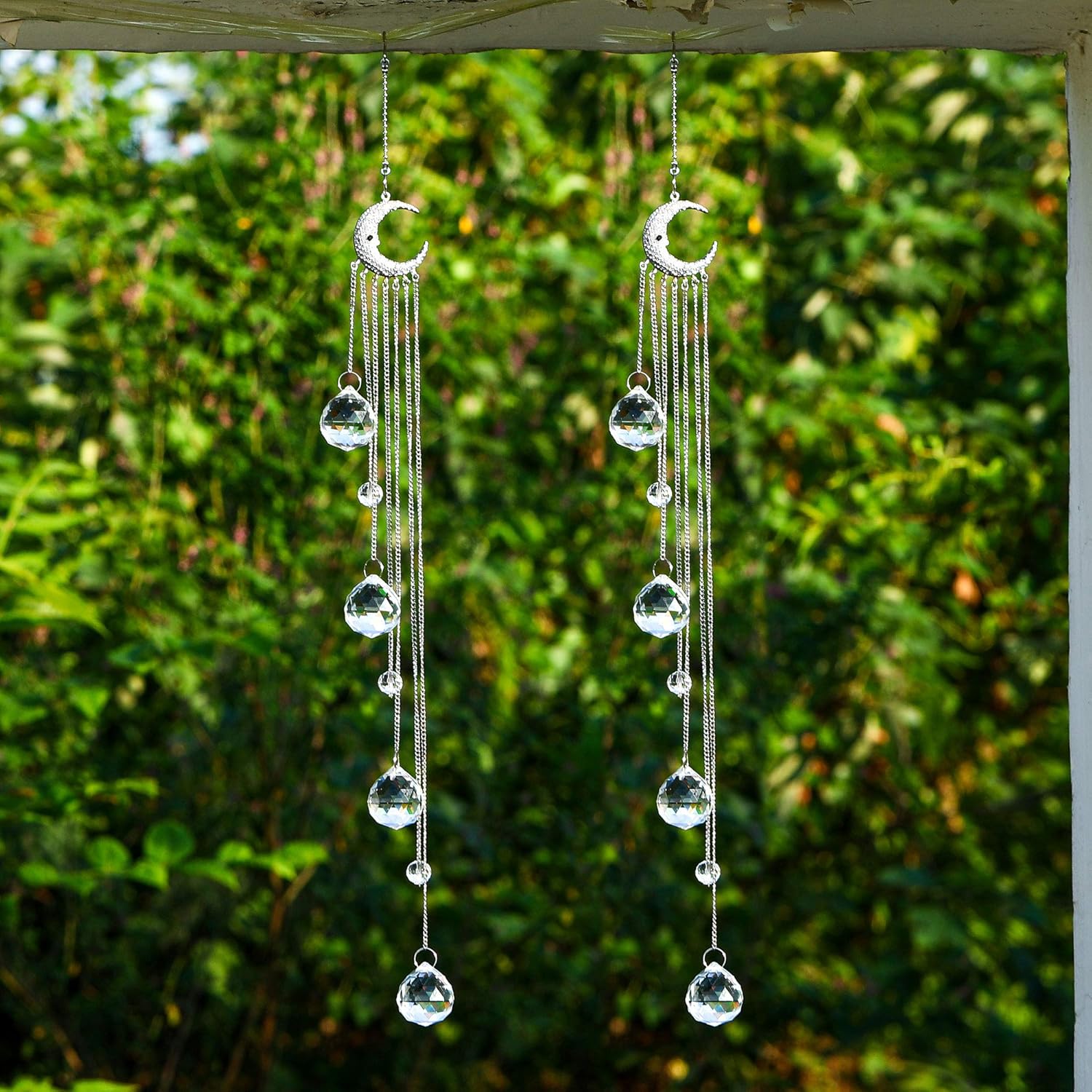 • Length of this crystal hanging ornament is around 21inch,small S hook on the top of metal chain,easy to hang to anywhere you like,porch,window,backyard,tree,garden,chandelier lamps,etc.