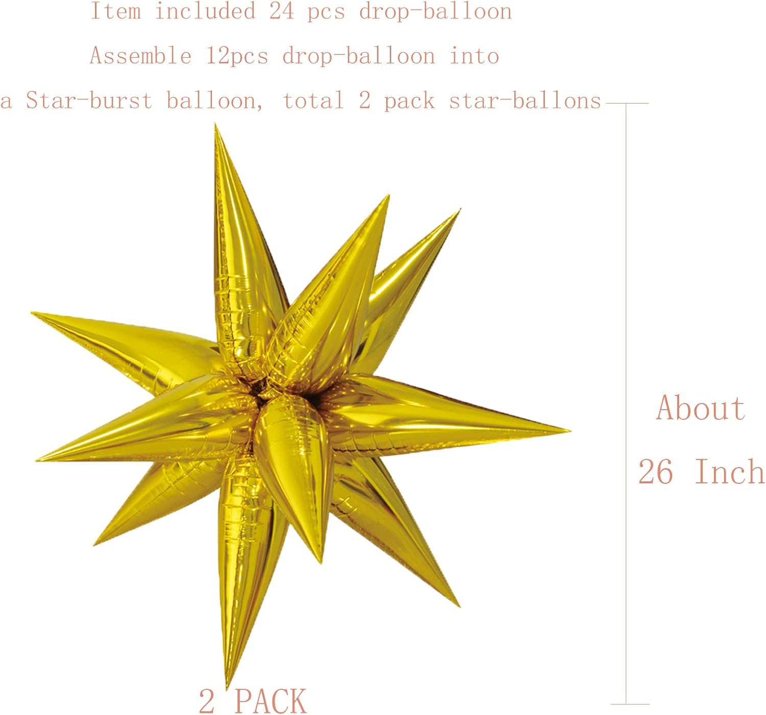• Star Balloons, Item included 24 pcs drop-balloon, assemble 12pcs drop-balloon into a Star-burst balloon, total 2pcs Star-burst balloon