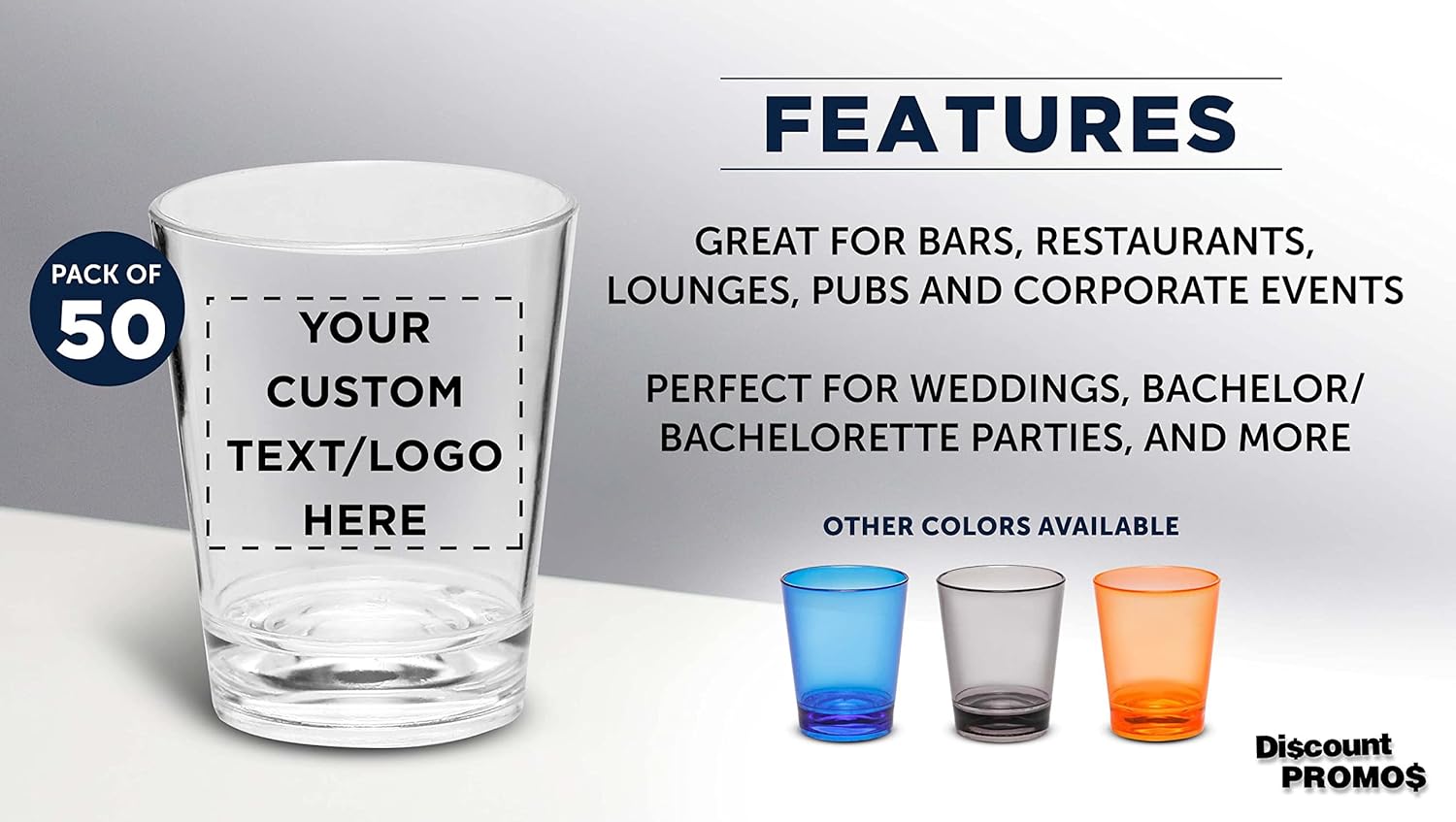 DISCOUNT PROMOS Custom Translucent Plastic Shot Glasses 1.5 oz. Set of 50, Personalized Bulk Pack - Acrylic, Great for Wedding, Party, Birthday, Gifts - Clear