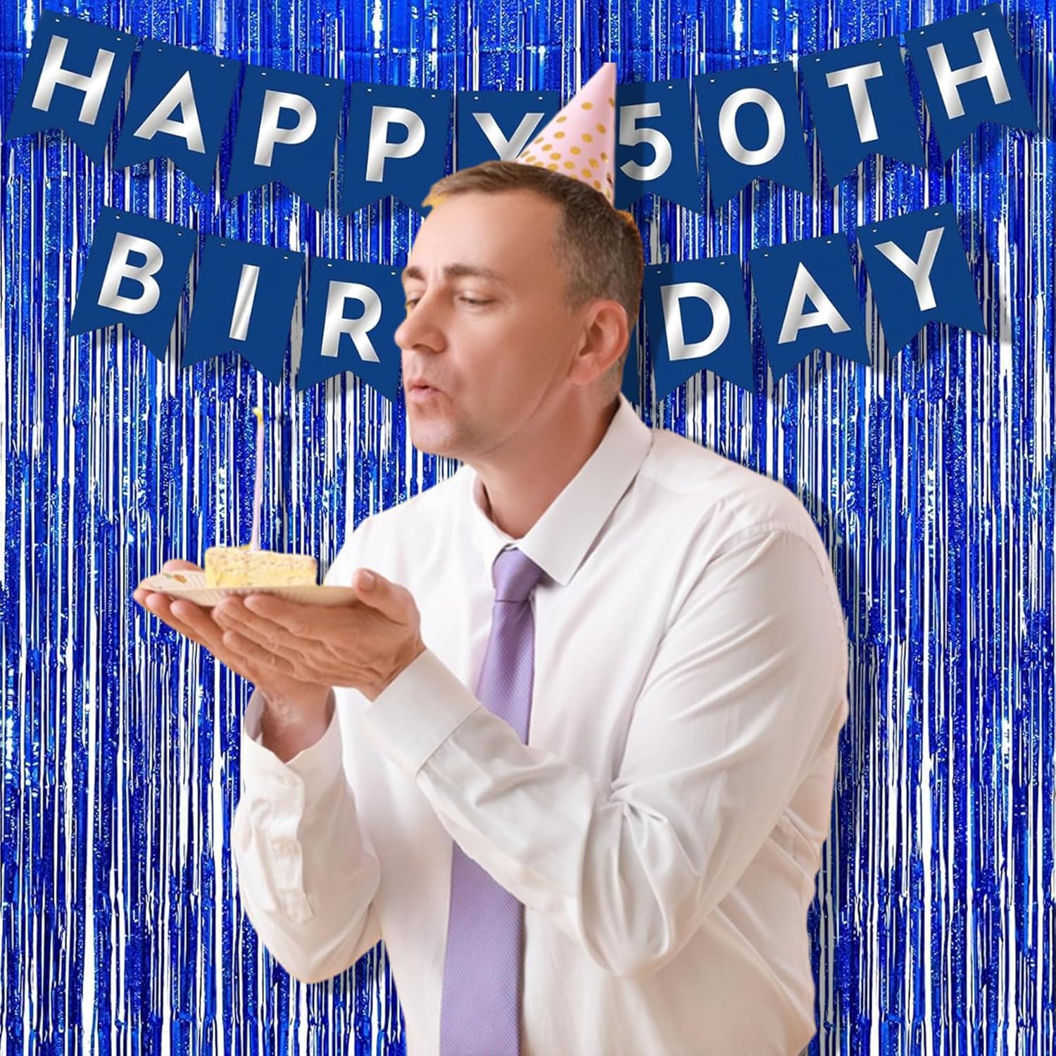 BRAVESHINE Blue Tinsel Foil Fringe Curtains - 2Pcs 3.2x8.2 ft Metallic Holidays Photo Backdrop for Boys Men Birthdays Homecoming Bachelor Bachelorette Engagement Sea Theme Ramadan Party Decorations