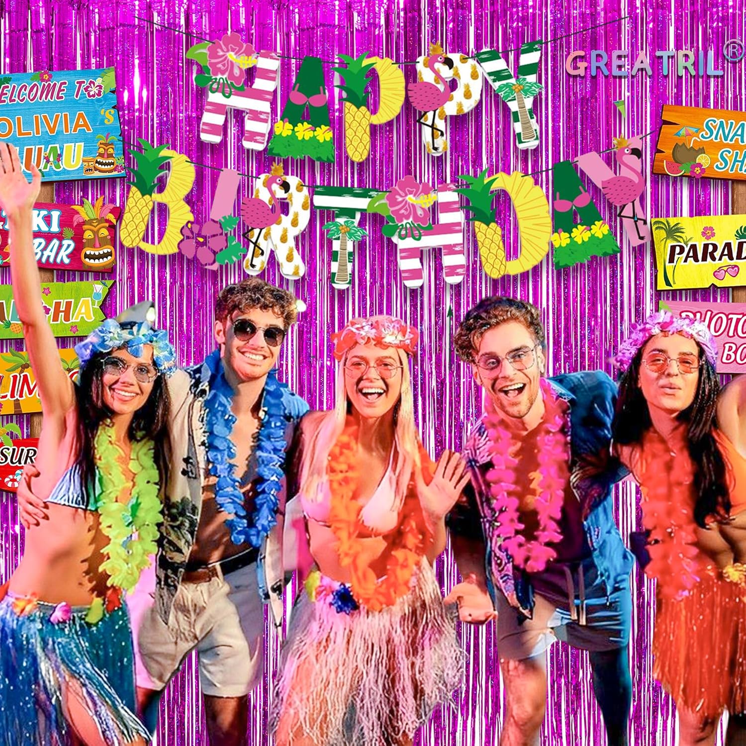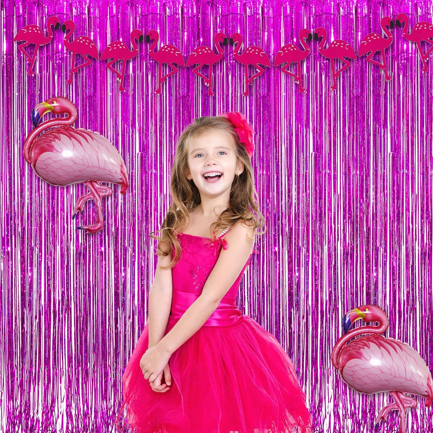 • GREATRIL 2-packs magenta foil fringe curtains. The size of each foil fringe curtain is 8.2 ft x 3.2 ft. You can cut this hot pink tinsel curtain according to your needs.