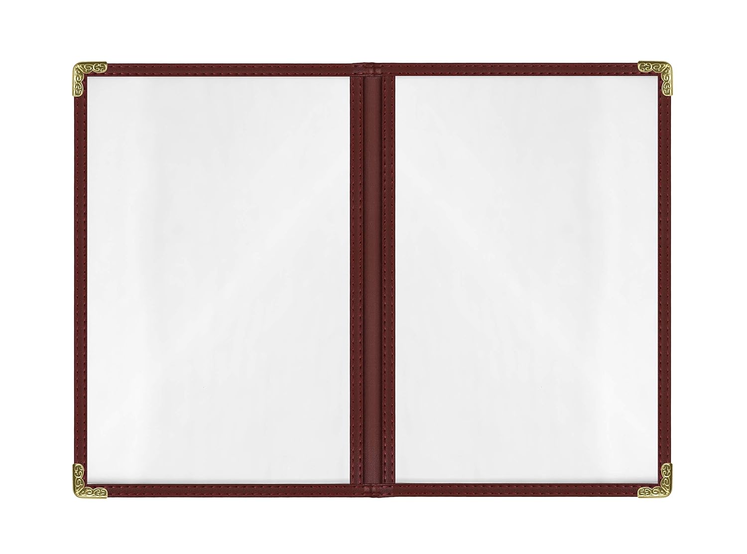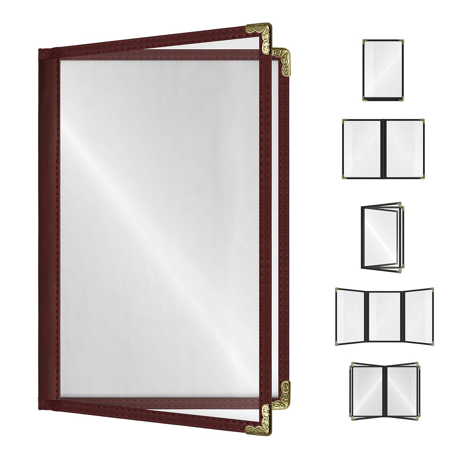 Goodsmart Restaurant Menu Covers – 25 Pack Burgundy 4-View, Side-Loading Menu Holders, Vinyl & Plastic Café Menu Covers, Clear Menu Sleeves, Fits 5.5" x 8.5", Leather-Style Design, Gold Corners
