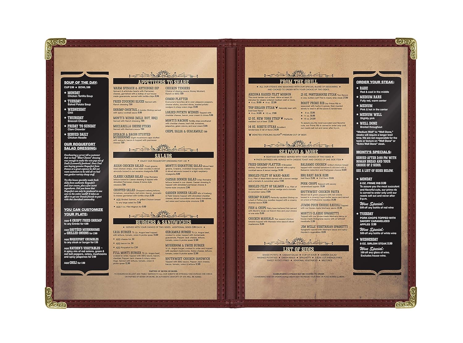• ✅Sophisticated Burgundy with Gold Accents: The elegant burgundy border and gold decorative corners add a refined touch to the menu cover, enhancing the presentation and creating a professional and polished look suitable for upscale or themed restaurants and cafes.