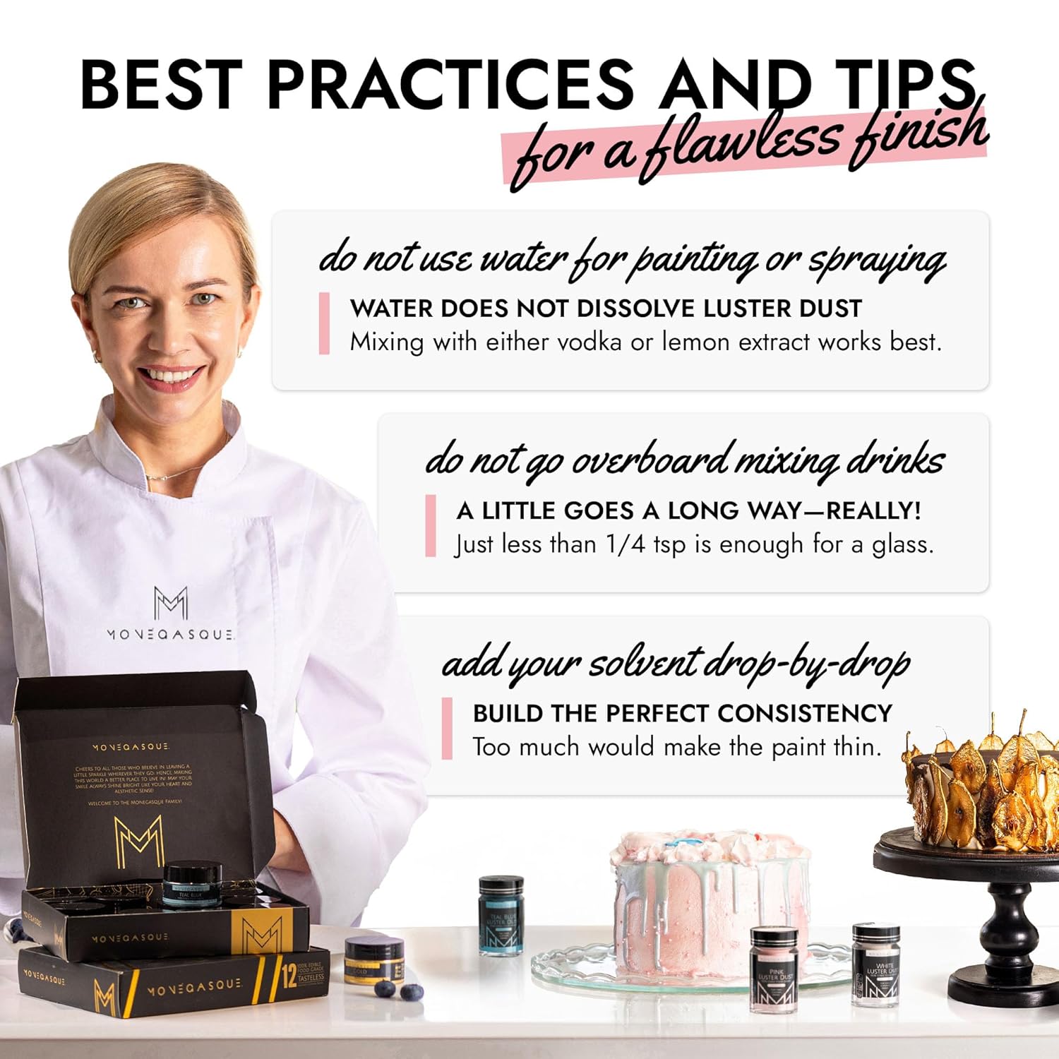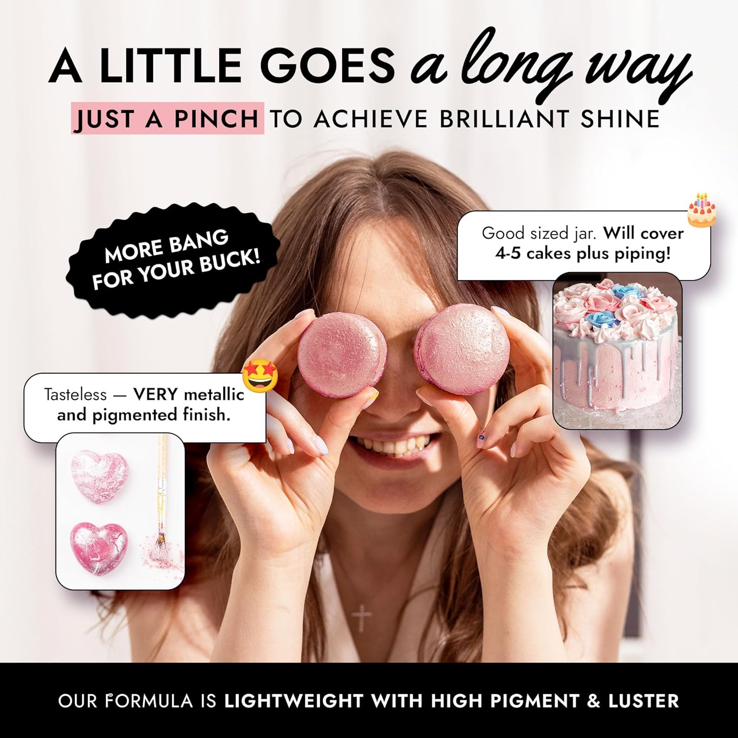 • EASY TO USE: Our pink luster dust is incredibly versatile. Apply with a wet brush, airbrush, or dry brush, and even mix into beverages. Achieve professional-looking results effortlessly at home, whether decorating halloween cakes or adding shimmer to cocktails.