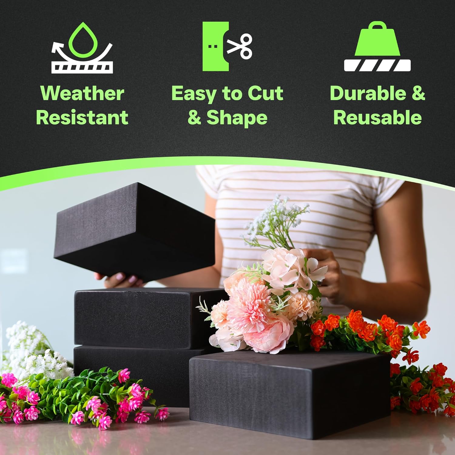 • Durable & Reusable: Designed for both indoor and outdoor use, these blocks are weather resistant; unlike traditional floral dry foam, this long-lasting material resists crumbling, provides extra stability, and can be repurposed for years to come