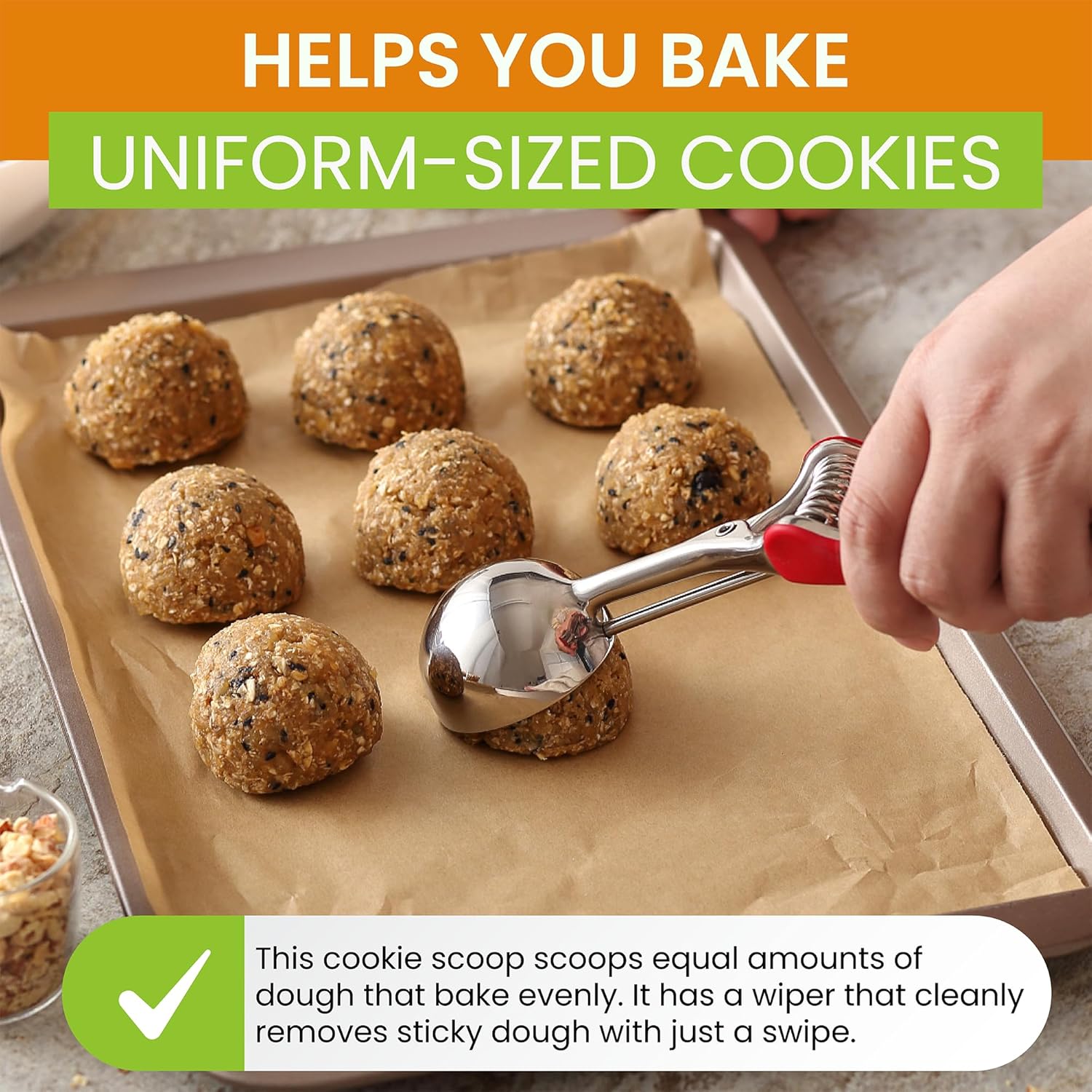 • Easy to Use - Using this cookie scooper for baking allows you to scoop effortlessly. It releases your cookie dough with a simple squeeze of the trigger, so you can make “store-bought-quality” cookies right at home. The metal cookie scoop is Dishwasher Safe making cleanup a breeze.