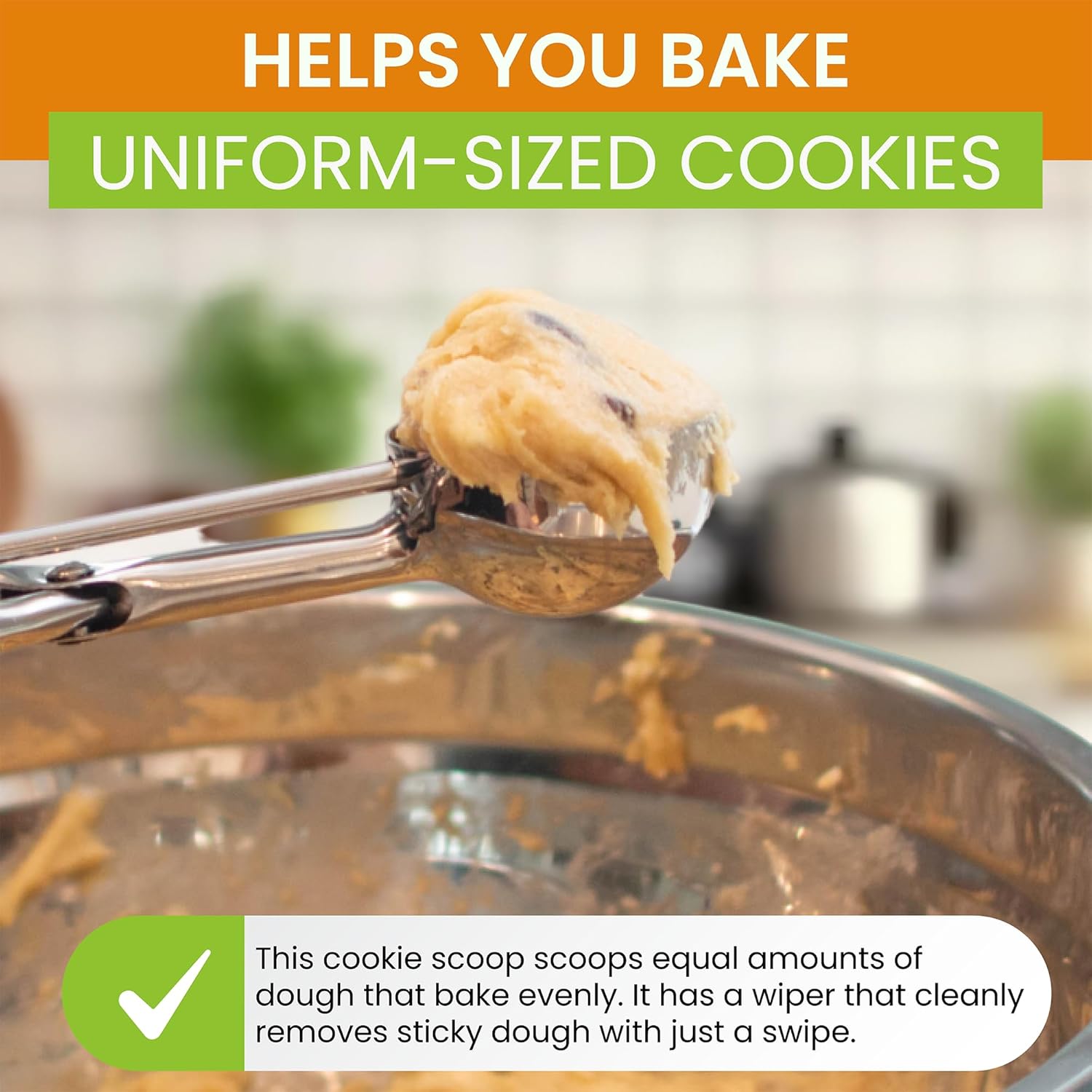 • Helps You Bake Uniform-Sized Cookies - The small size 1 tablespoon cookie scoop is size #60, yields a 2 inch cookie. This cookie baller scoop scoops batter into several pieces of equal shape and sizes. It has a wiper that cleanly removes sticky dough with just a swipe. So, you can make as many batches of cookies as you want without hassle.