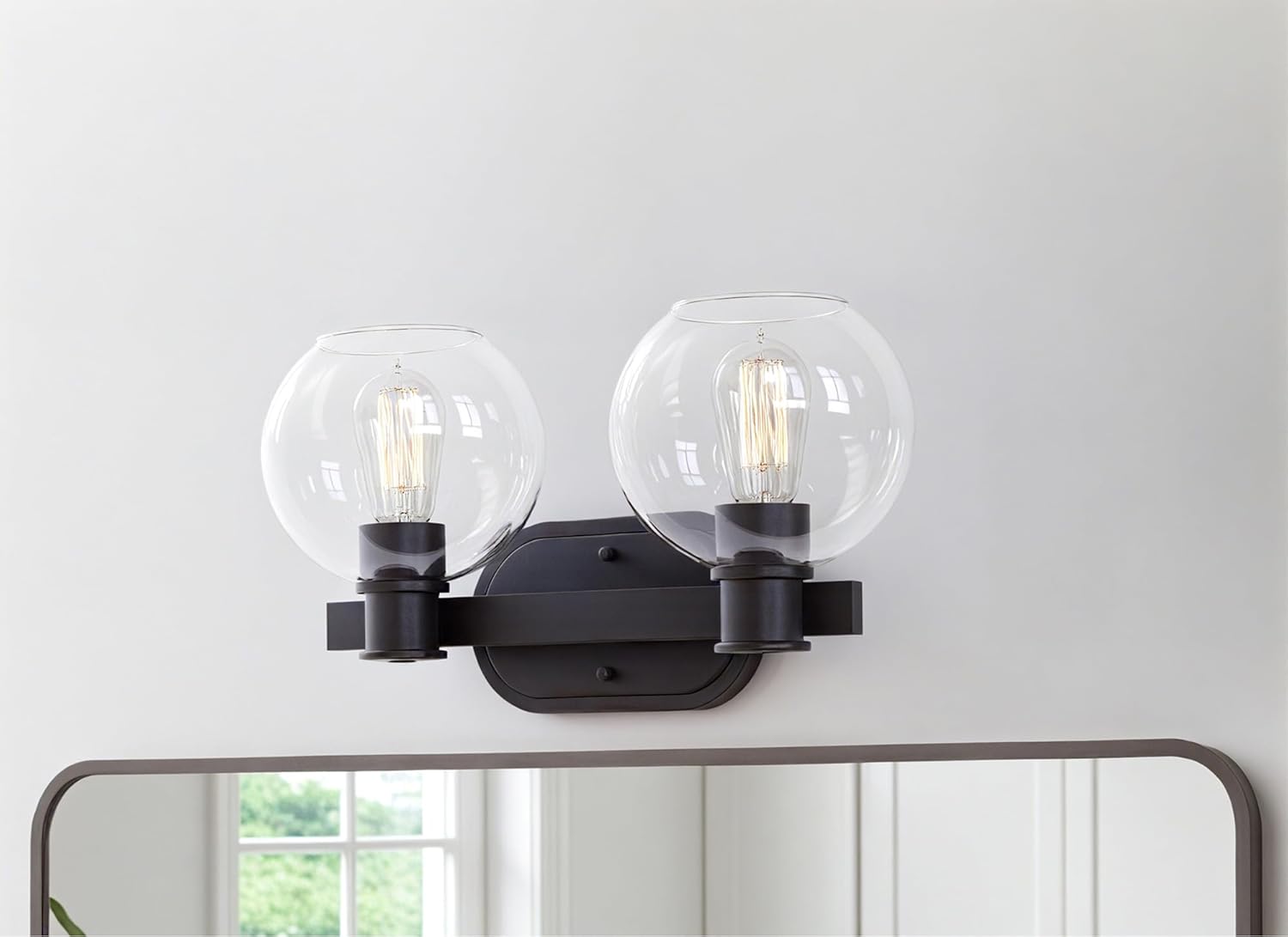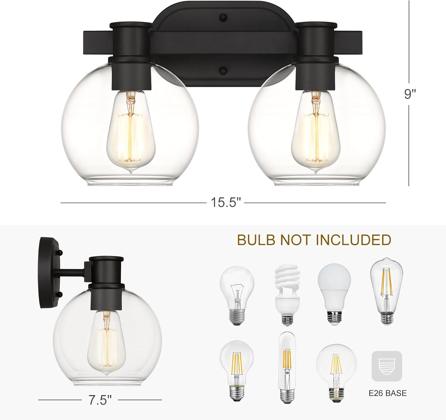Dan Modern Farmhouse 2-Light Vanity Light Wall Sconce Lighting with Clear Glass Globe Shade in Light Black Finish for Bedroom, Hallway, Kitchen