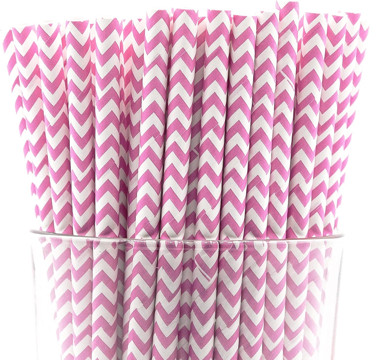 • Pack of 900 Pink Chevron wrapped paper straws that are 7.75” long and have a diameter of 0.25”. Made with 4-ply paper which translates into thicker and more resilient straws that won’t wilt or change shape in both hot and cold drinks.
