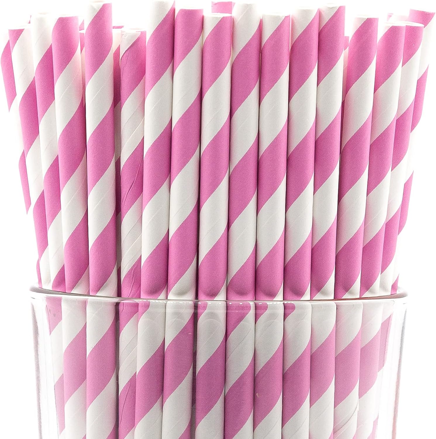 • Pack of 900 Baby Pink Swirls wrapped paper straws that are 7.75” long and have a diameter of 0.25”. Made with 4-ply paper which translates into thicker and more resilient straws that won’t wilt or change shape in both hot and cold drinks.