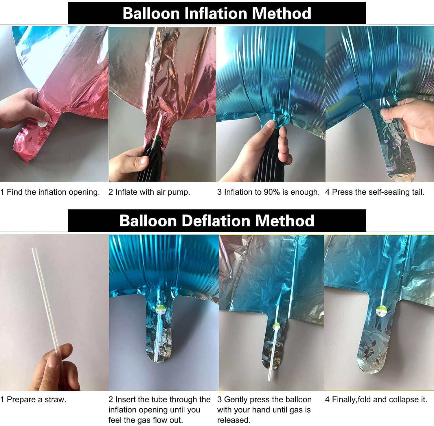 • Suitable: Inflate with helium or air,can be self-sealed, reusable balloons, do not use once to throw away