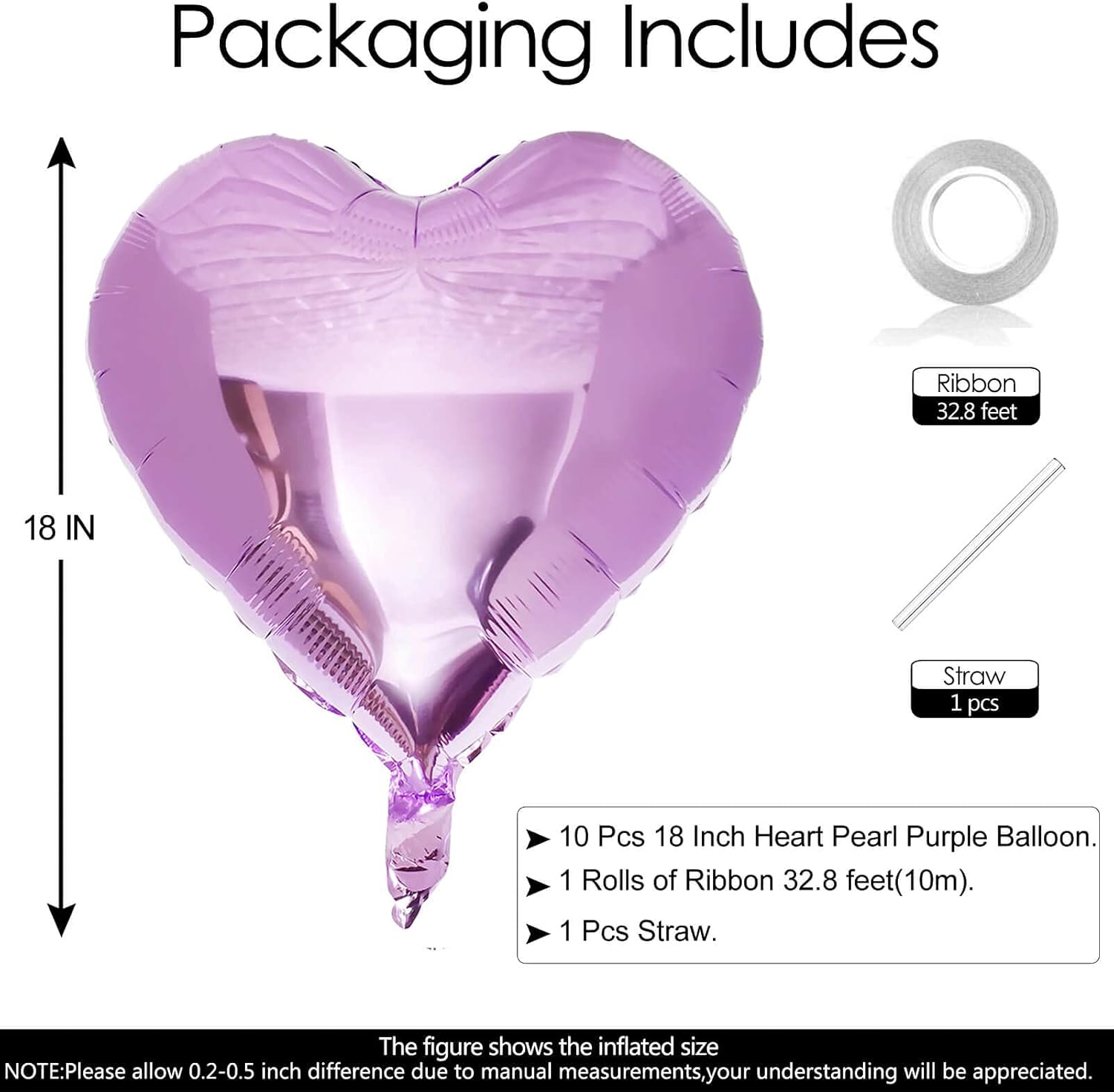 • Package Included:10Pcs 18 inch Pearl Purple Heart Balloons (uninflated) + 1pcs Straw +1pcs 32 foot Ribbon Roll