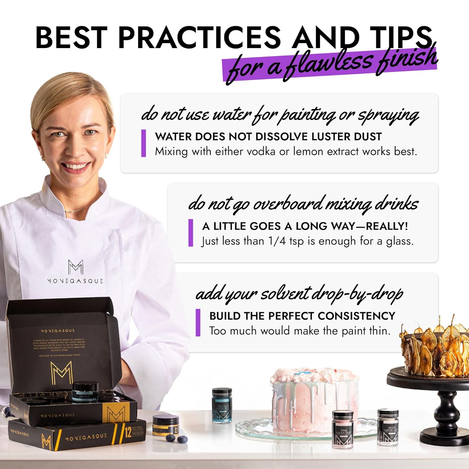 • EASY TO USE: Our purple luster dust is incredibly versatile. Apply with a wet brush, airbrush, or dry brush, and even mix into beverages. Achieve professional-looking results effortlessly at home, whether decorating halloween cakes or adding shimmer to cocktails.