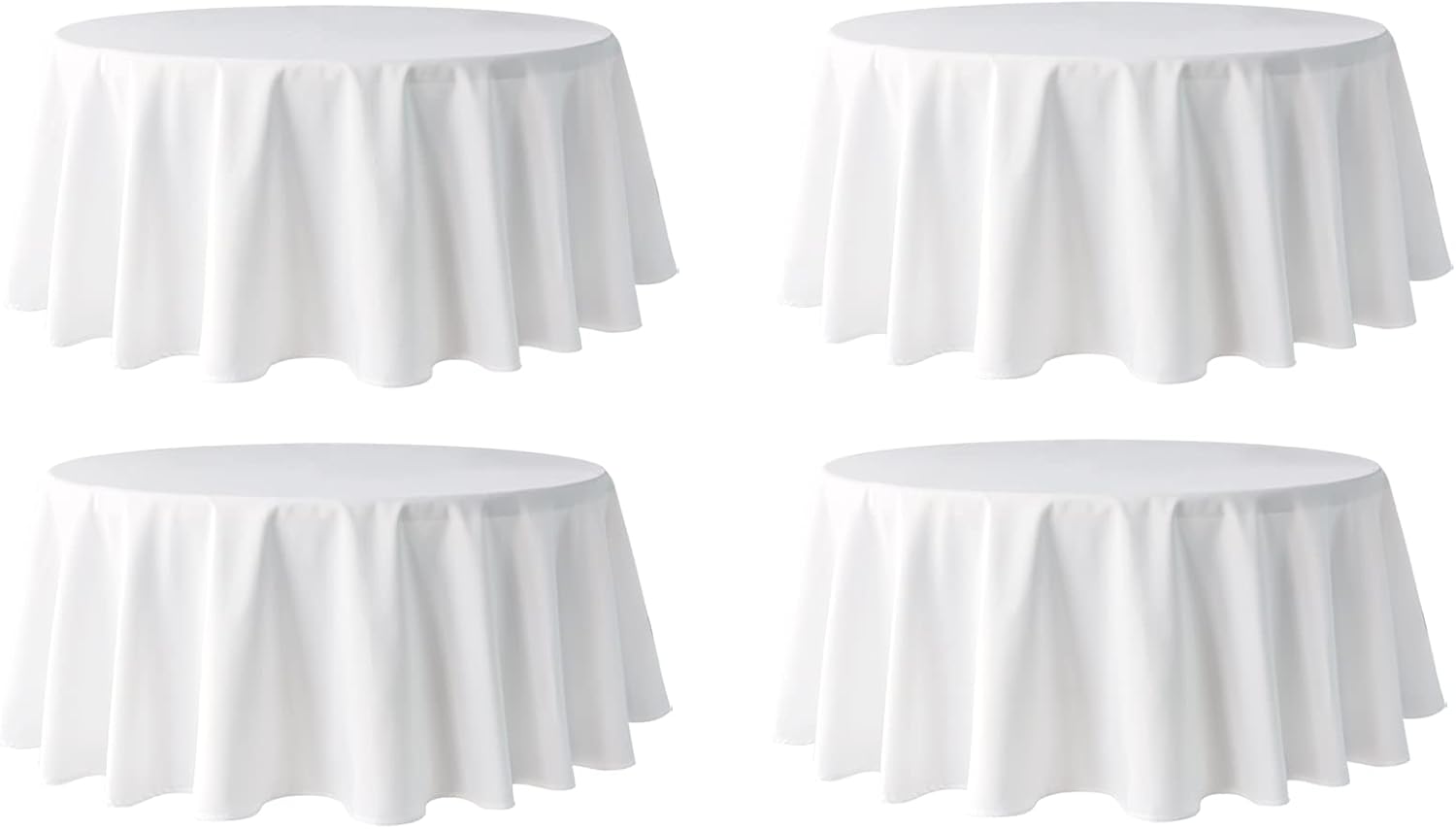 Pomp White 120" Inch Round Premium Polyester Tablecloth (4 Pack) | Wrinkle + Stain Resistant Easy Care Fabric | Fits Round or Circle Table