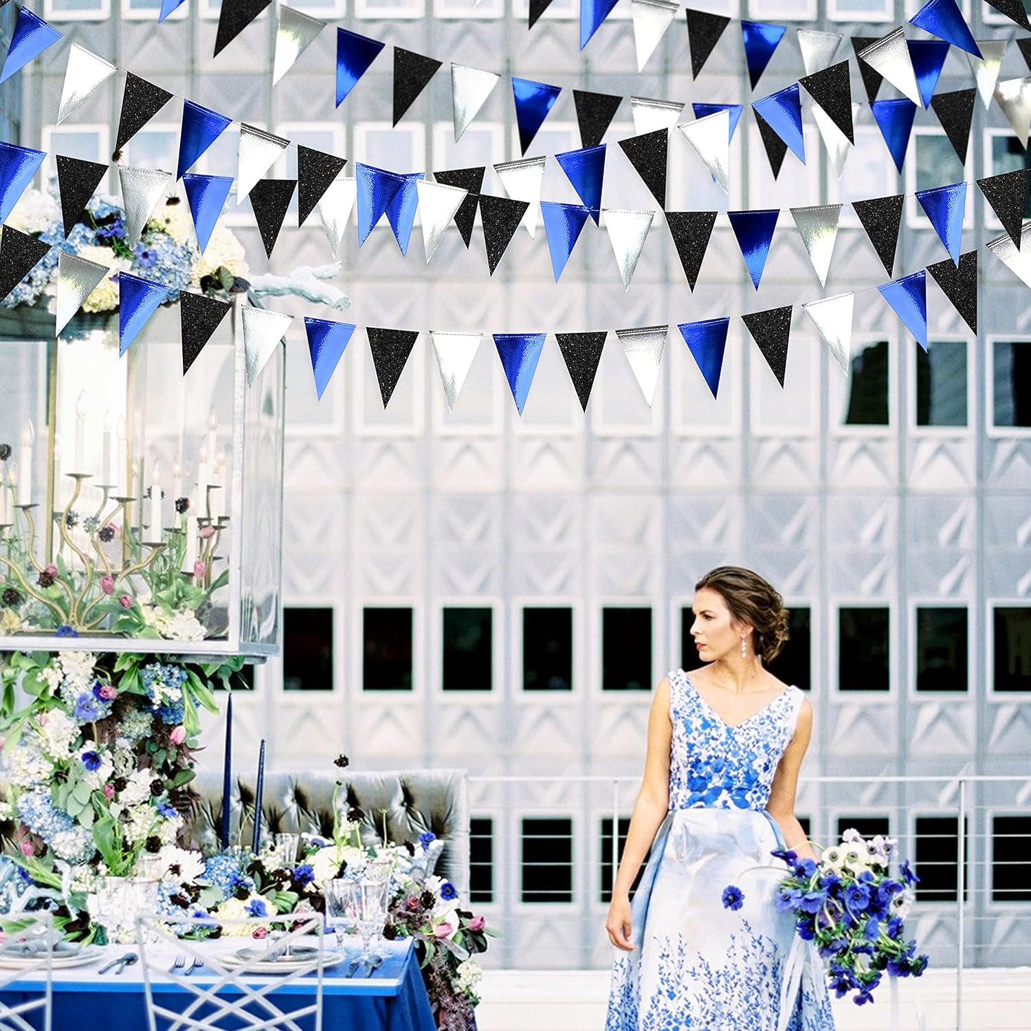 • 💙PACKAGE CONTAINS- 3 set of royal blue black silver hanging triangle party banner,each string is 3 meters with 26 pieces triangular flags,so total is 9 meters = 30 feet and 78 pieces flags. Size of each flag:14cm x 9cm/5.5" x 3.5" (L x W).