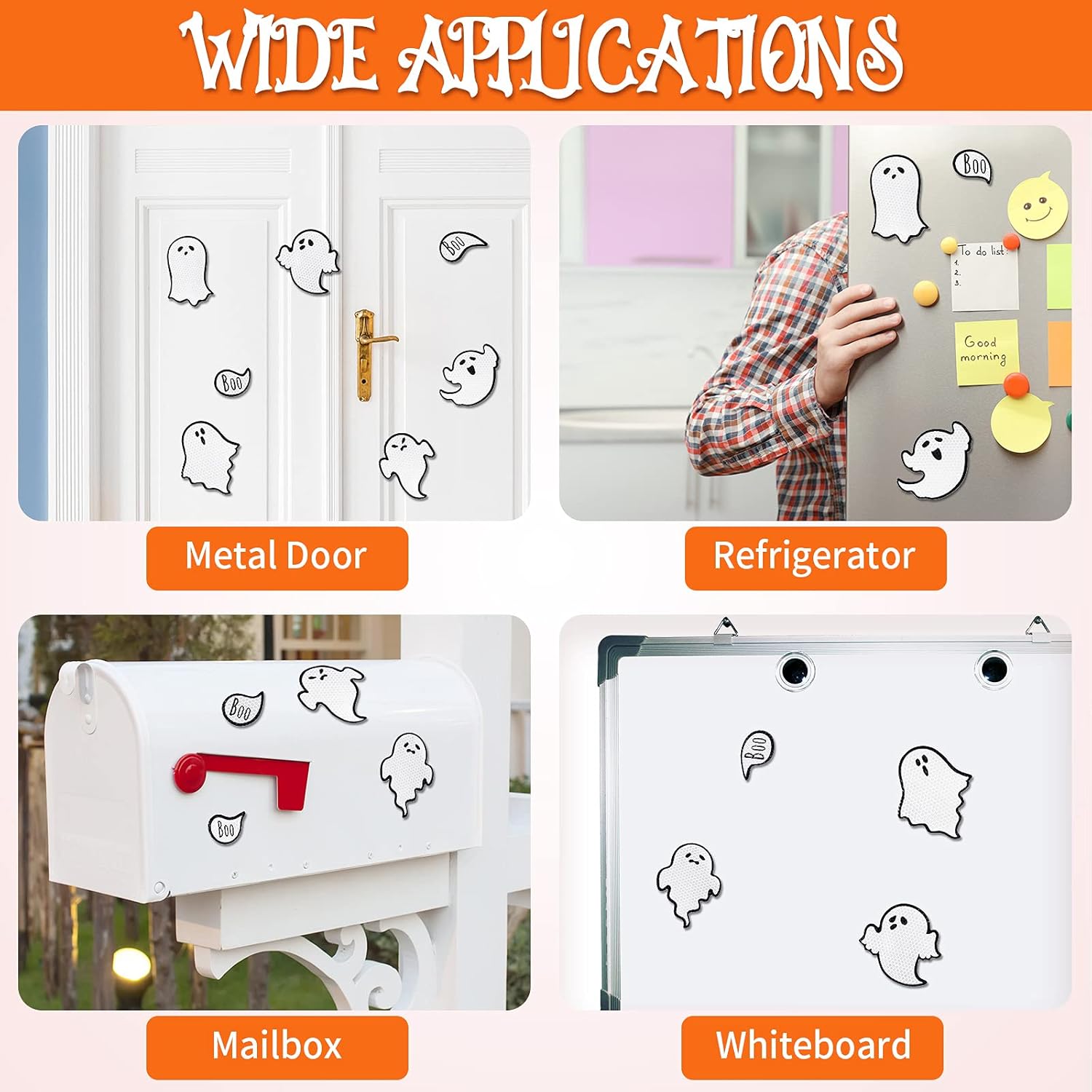 • Holiday theme: these garage door magnets decorations adopt holiday as the theme, containing classic images of ghost, as well as the word [Boo] in the dialog box shaped sticker, and they are reflective, which also can create a spooky atmosphere even at night