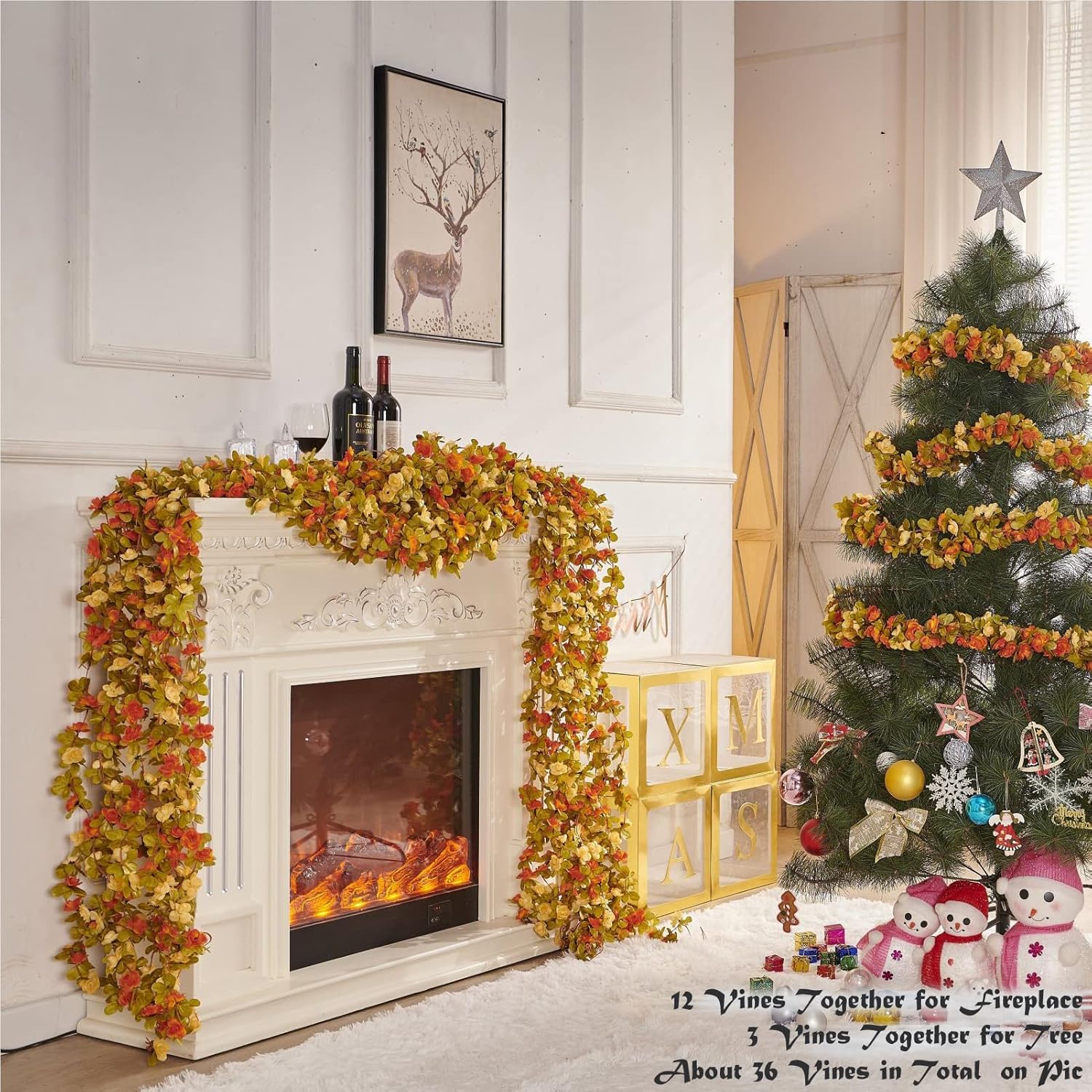• Package: 8 vine plant hanging fake flower garland, 4 bags in total. 8.2FT (250CM) per vine, each plant with 45 flowers. 1.5"(3.8CM) in diameter of rose heads. 45 leaves per vine. When you connect these 8 vines end-to-end, the total length can reach 66ft. The single vine is not thick, but when you wrap 8 pcs rose vines side by side together, you will get an 8.2 ft bigger flower vine which is puffy & thick enough to decorate your room. We used multiple vines wrapped side by side in our picture