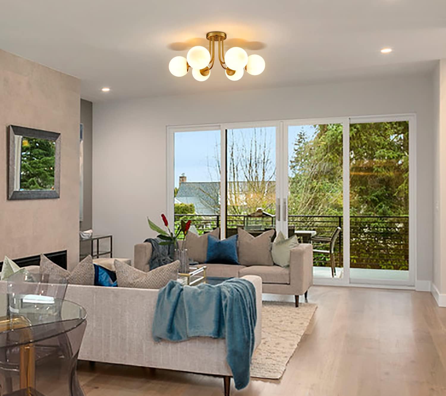 • The 6-light sputnik semi flush mount light fixtures crafted from globe off-white manual blown glass ,combination of electrophoresis brass gold metal finish.It can reflect the sparkling and even lighting ,adds more chic and luxury feeling .The durable material can avoid rust for a long time used.