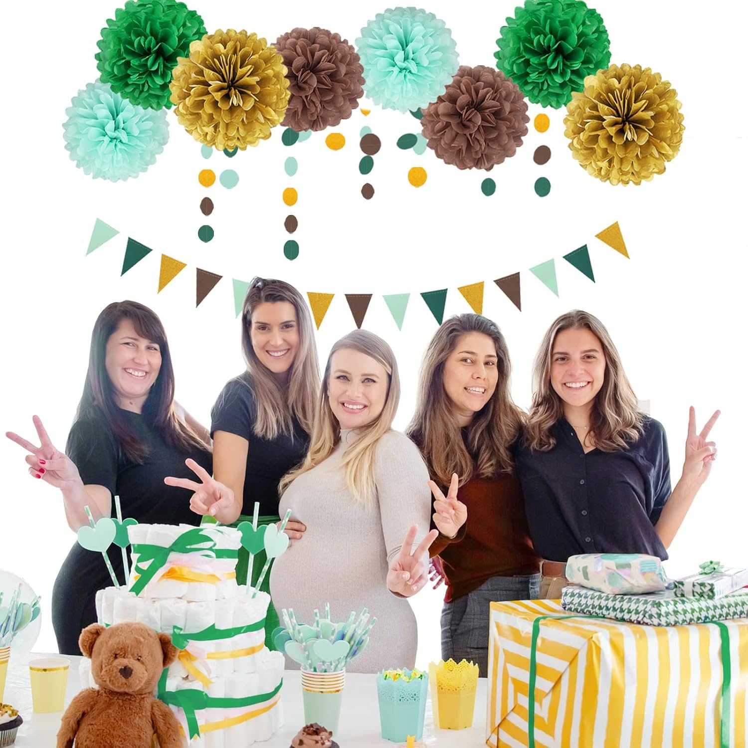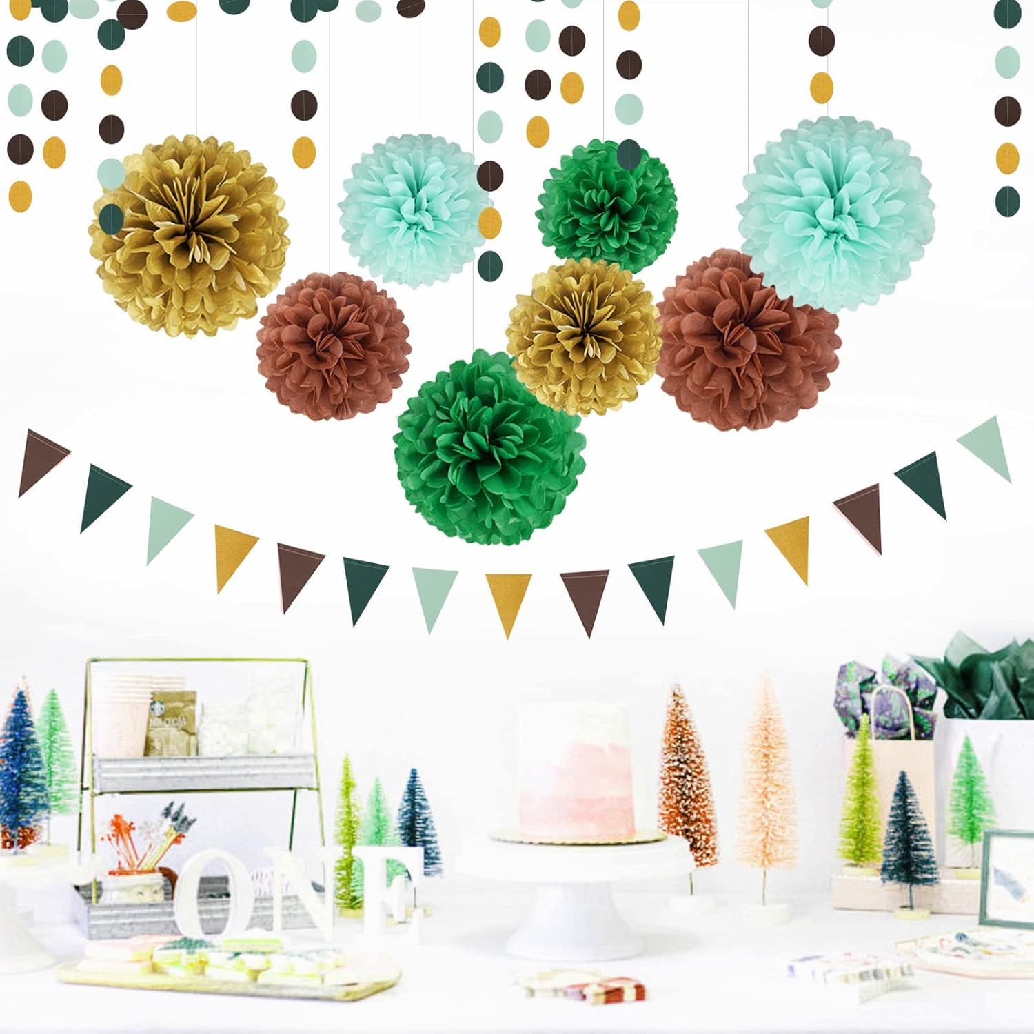 • 【Sage Green Mint Brown Gold Party Decorations】Kit include 8pcs tissue paper pom poms,4pcs 8",4pcs 10".1pcs 13ft circle garland.1pcs 9.5ft tissue paper tassel garland with 20pcs tassel.1pcs 9.7ft triangle flags banner.