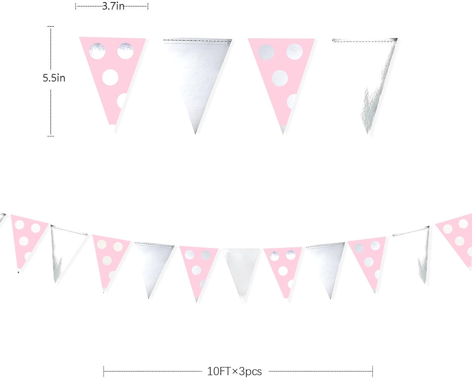 • Environmental Material - Our silver pink polka dot hanging pennants banner are made of two different materials paper. Double sided metallic paper and high quality cardstock, carefully hand-made and machine-sewn together with thread.durable and reusable.