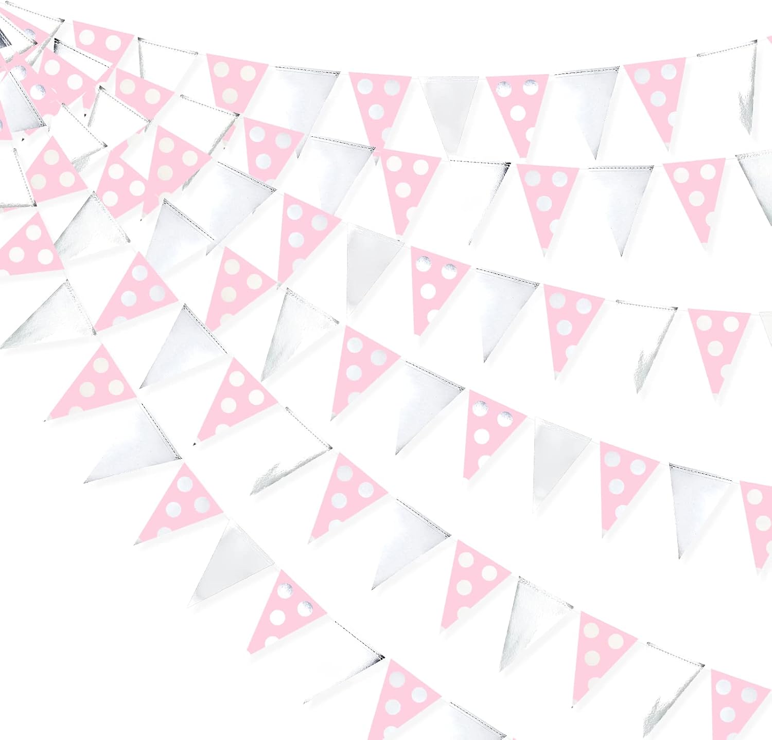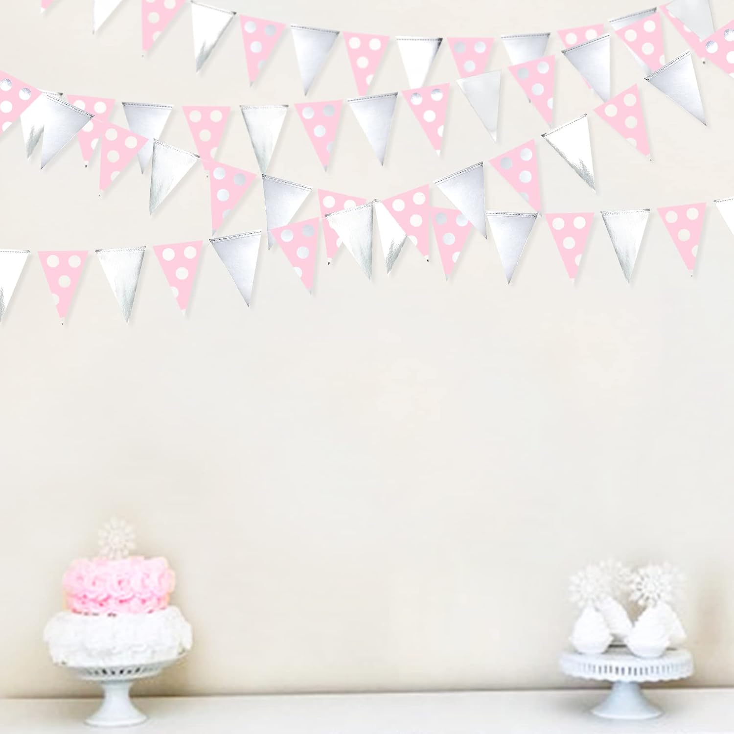 30 Ft Silver Pink Polka Dot Pennant Banner Blush Paper Circle Dot Triangle Flags Bunting Garland for Baby Shower Bridal Shower Wedding Bachelorette Christmas Holiday Girls Birthday Party Decorations