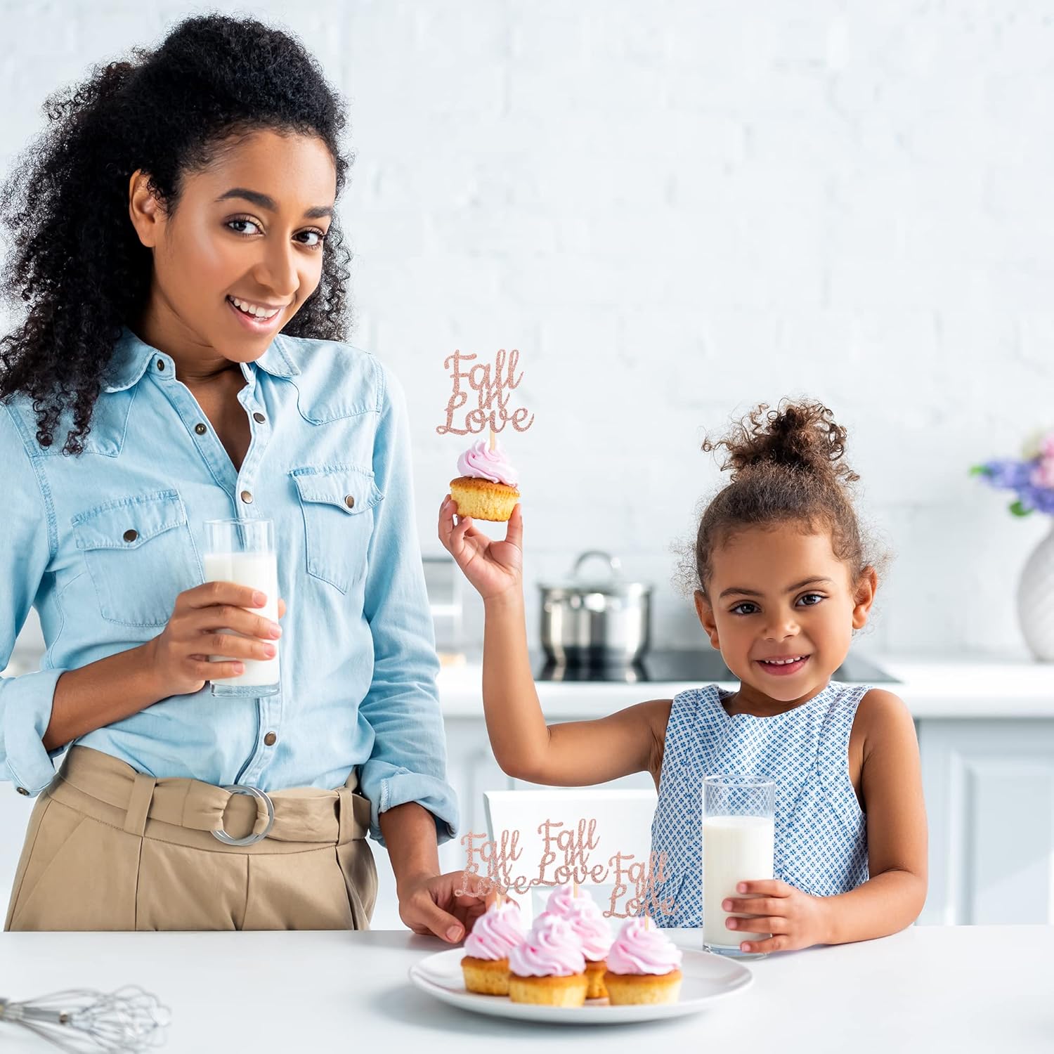 24 PCS Fall in Love Cupcake Toppers Glitter Bridal Shower Cake Picks Decorations for Wedding Engagement Anniversary Birthday Party Supplies Rose Gold