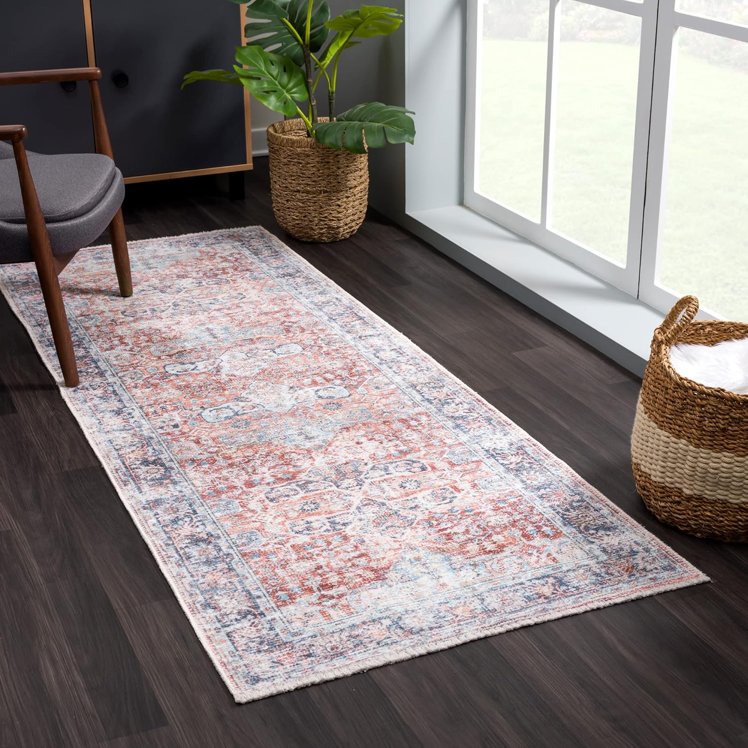 Bloom Rugs Caria Washable Non-Slip 10 ft Runner - Brick/Dark Blue Traditional Runner for Entryway, Hallway, Bathroom, and Kitchen - Exact Size: 2'6" x 10'
