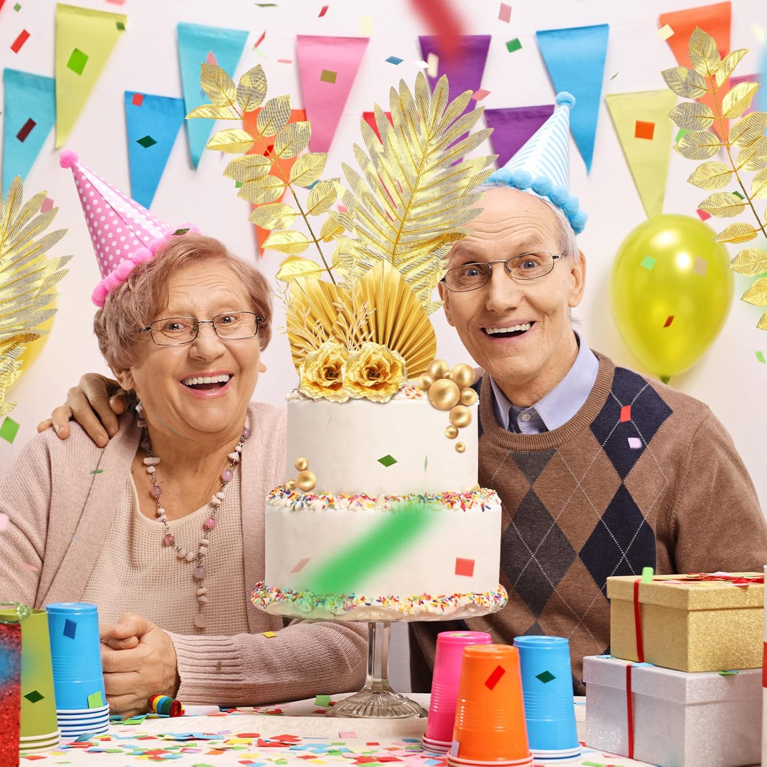 26 Pieces Happy Birthday Cake Topper Gold Cake Decorations Palm Leaves Balls Cupcake Toppers Floral Flower Artificial Leaves for Birthday Wedding(Gold)