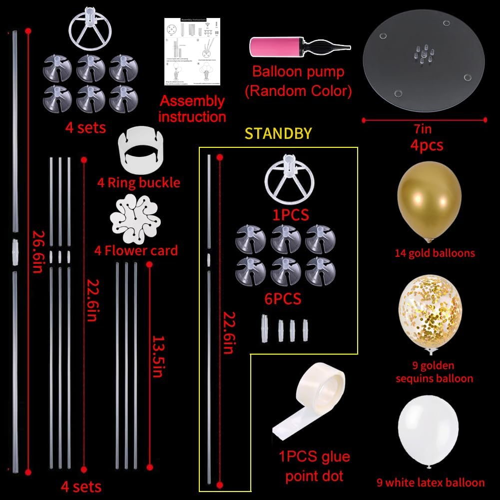 • Package Includes: The balloon stand kit includes 4 reusable balloon centerpiece table decorations and 12 inch 32 pcs Latex Balloons (14 gold balloons,9 white balloons,9 gold confetti balloons),glue point dots,balloon pump,balloon clips,and tie tool.You don’t need to waste money to buy balloons
