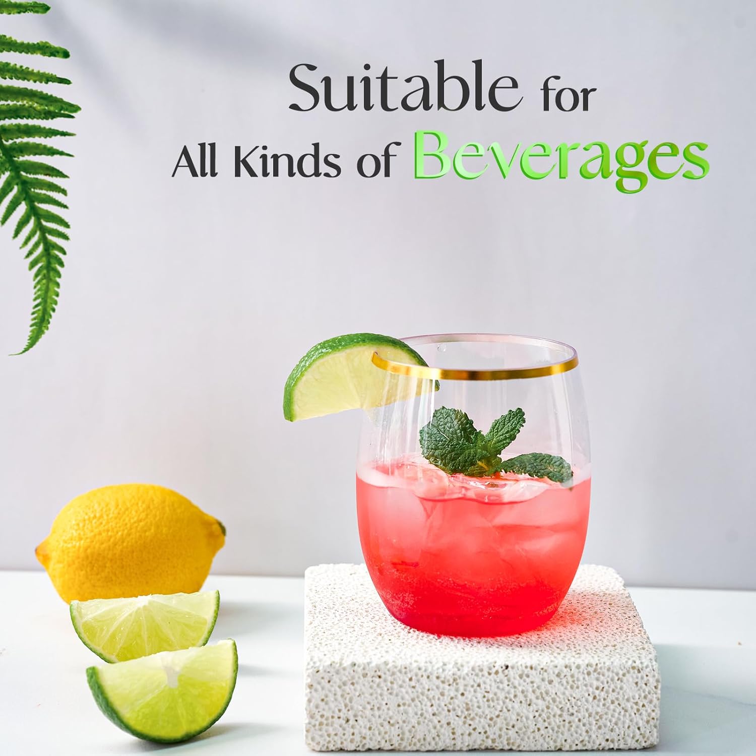 • These gold rim plastic wine cups are safe for you and your guests; Stemless plastic wine glasses are made of food-grade plastic; Thickened plastic material makes the wine glass more sturdy and not easy to warp