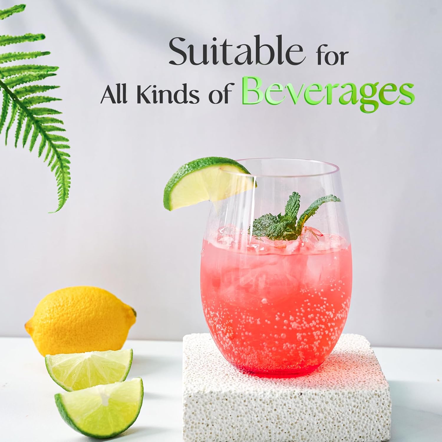 • Our clear stemless plastic wine glasses are heavy duty, unbreakable, shatterproof, disposable and reusable; High quality PET plastic makes the wine glass look crystal clear and adds a touch of ambiance to your party