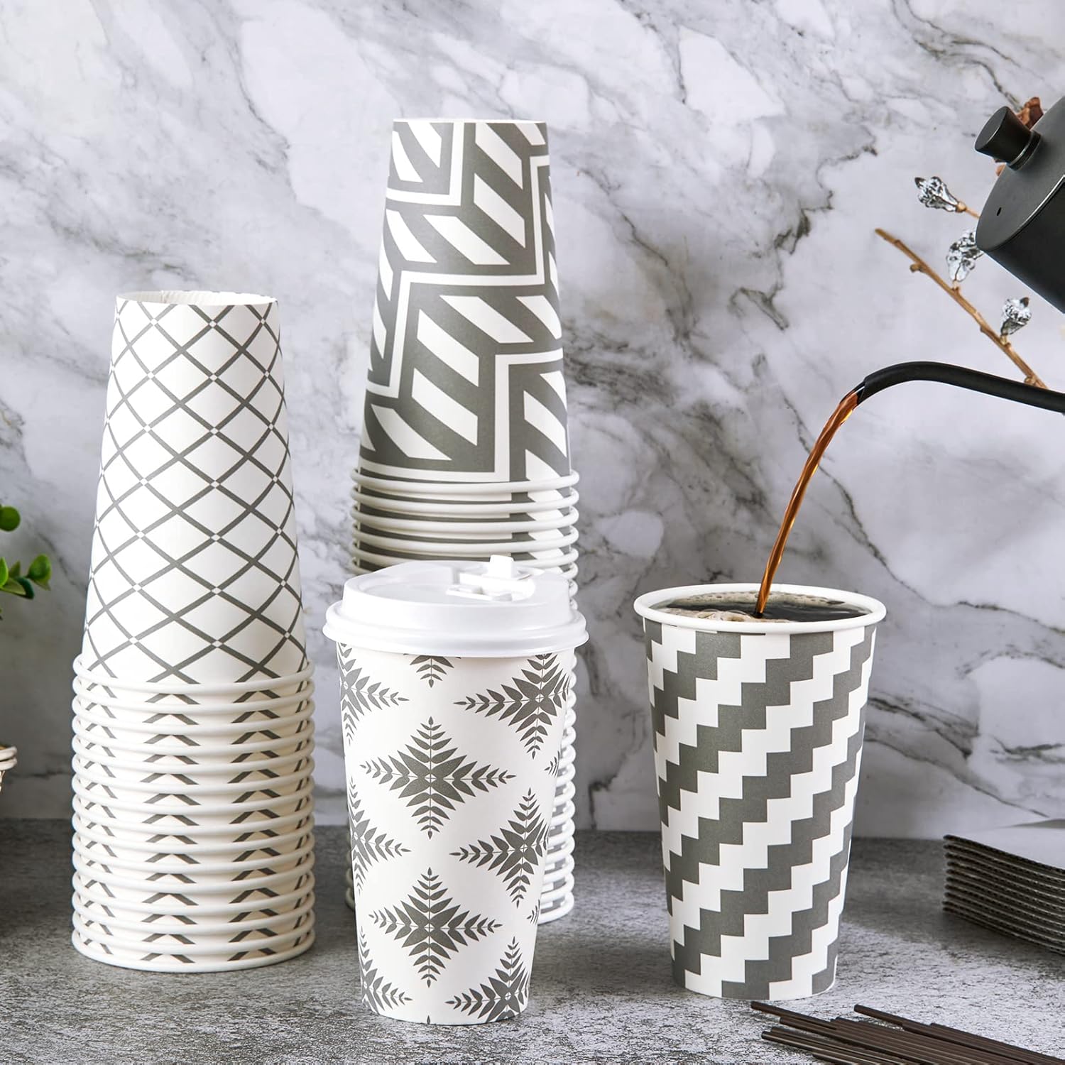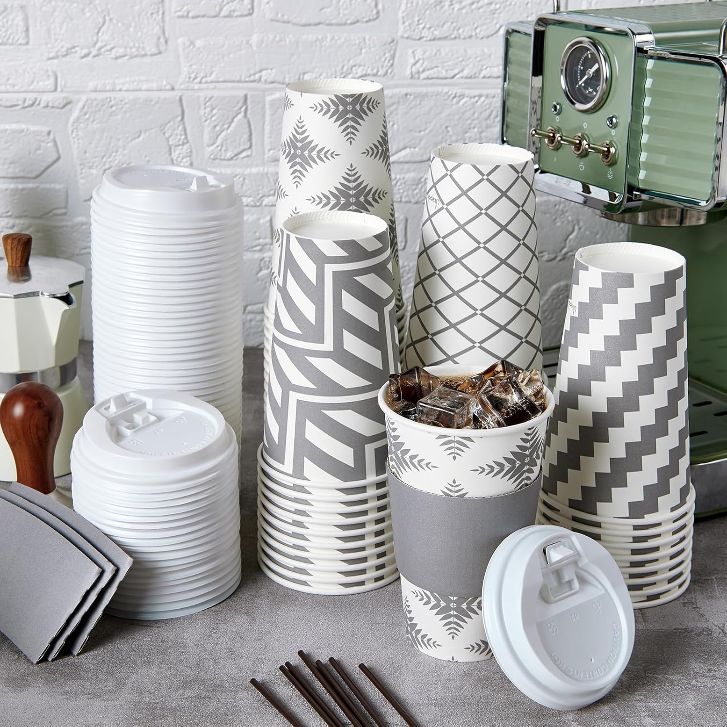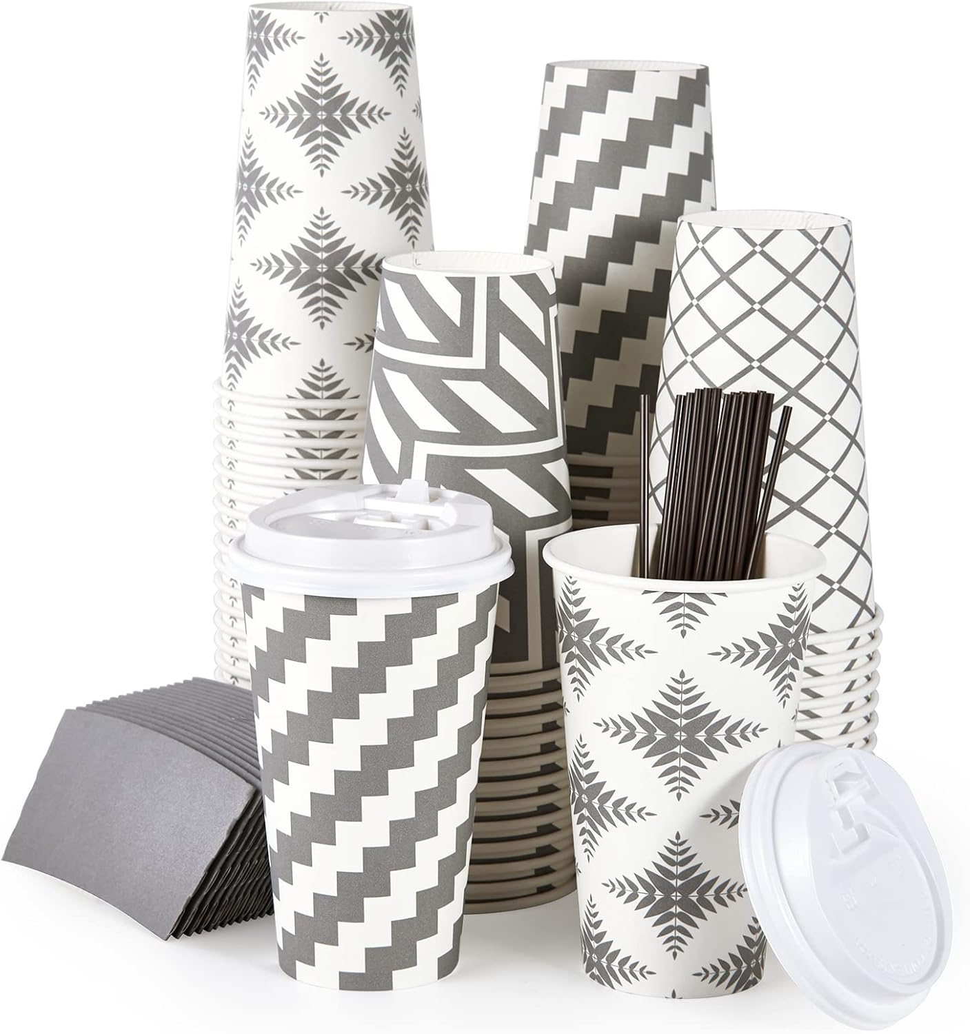 • Great Value Pack: You will receive a pack of 100 16 oz disposable cups, including 100 cups in four grey designs, 100 white lids, 100 grey cup sleeves, and 100 straws