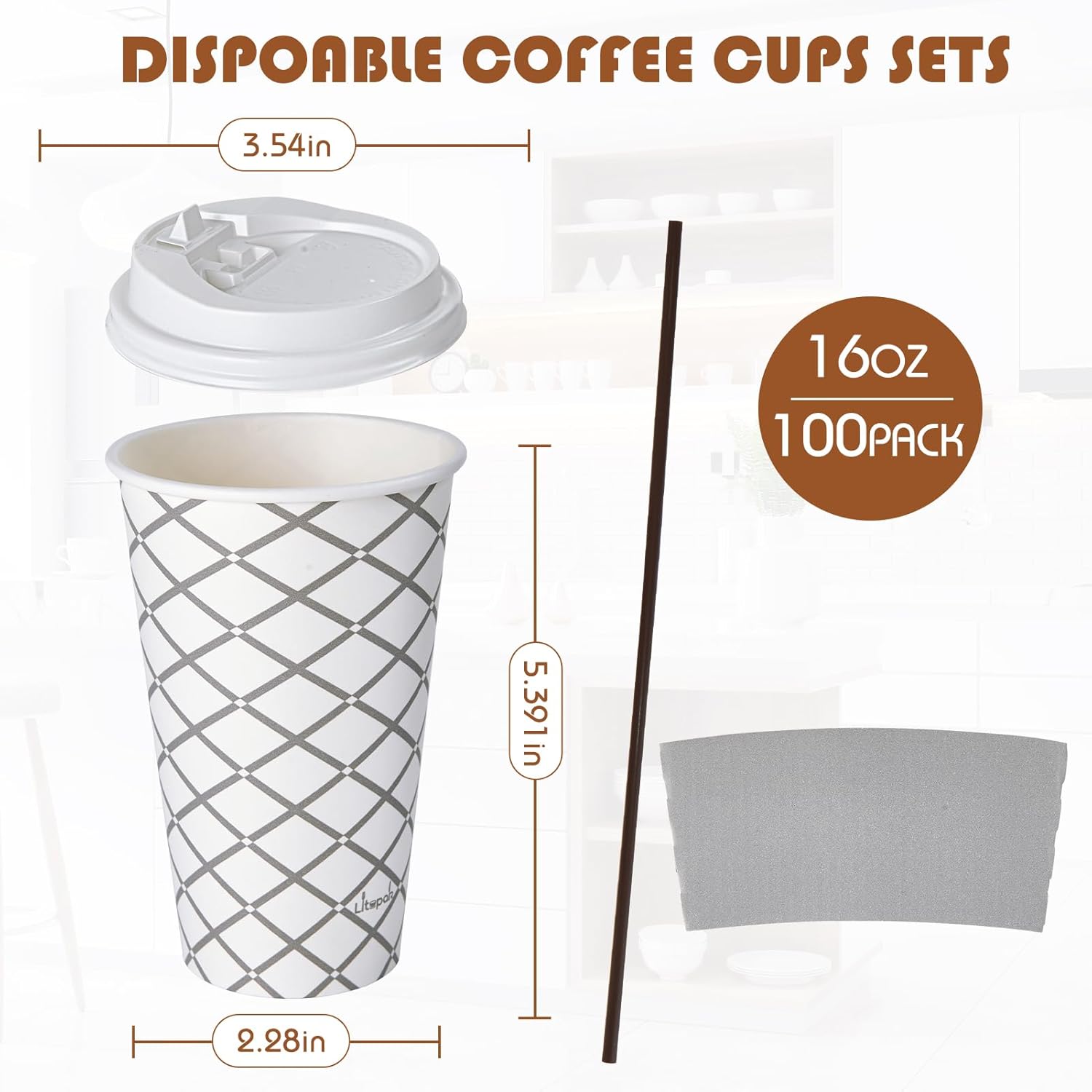 LITOPAK 100 Pack 16 oz Paper Coffee Cups, Disposable Coffee Cups with Lid, Sleeve, and Straws for Home, Stores, and Cafes