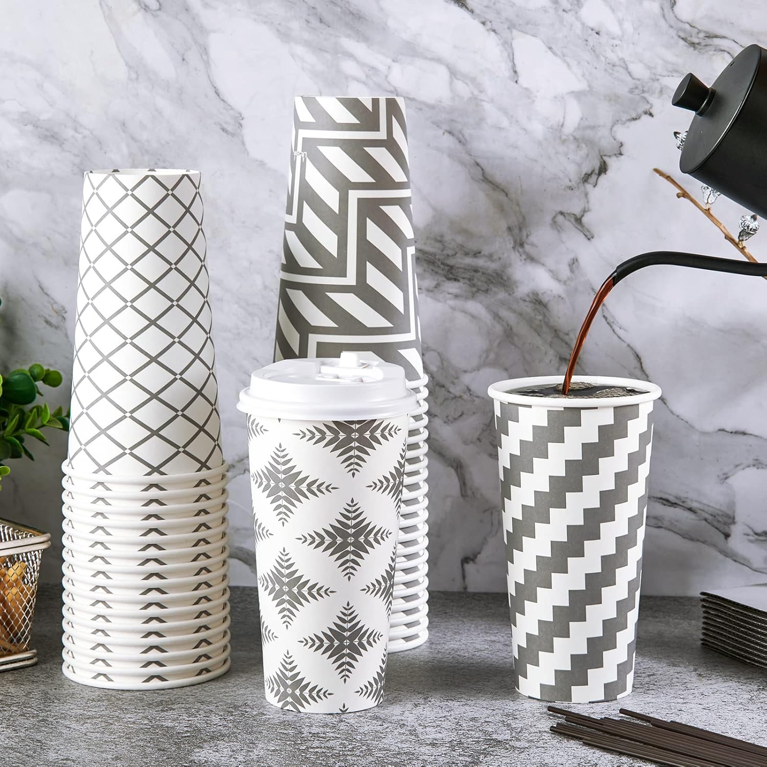 • Great Value Pack: You will receive 100 pack 20 oz disposable cups, including 100 cups in four grey designs, 100 white lids, 100 grey cup sleeves, and 100 straws