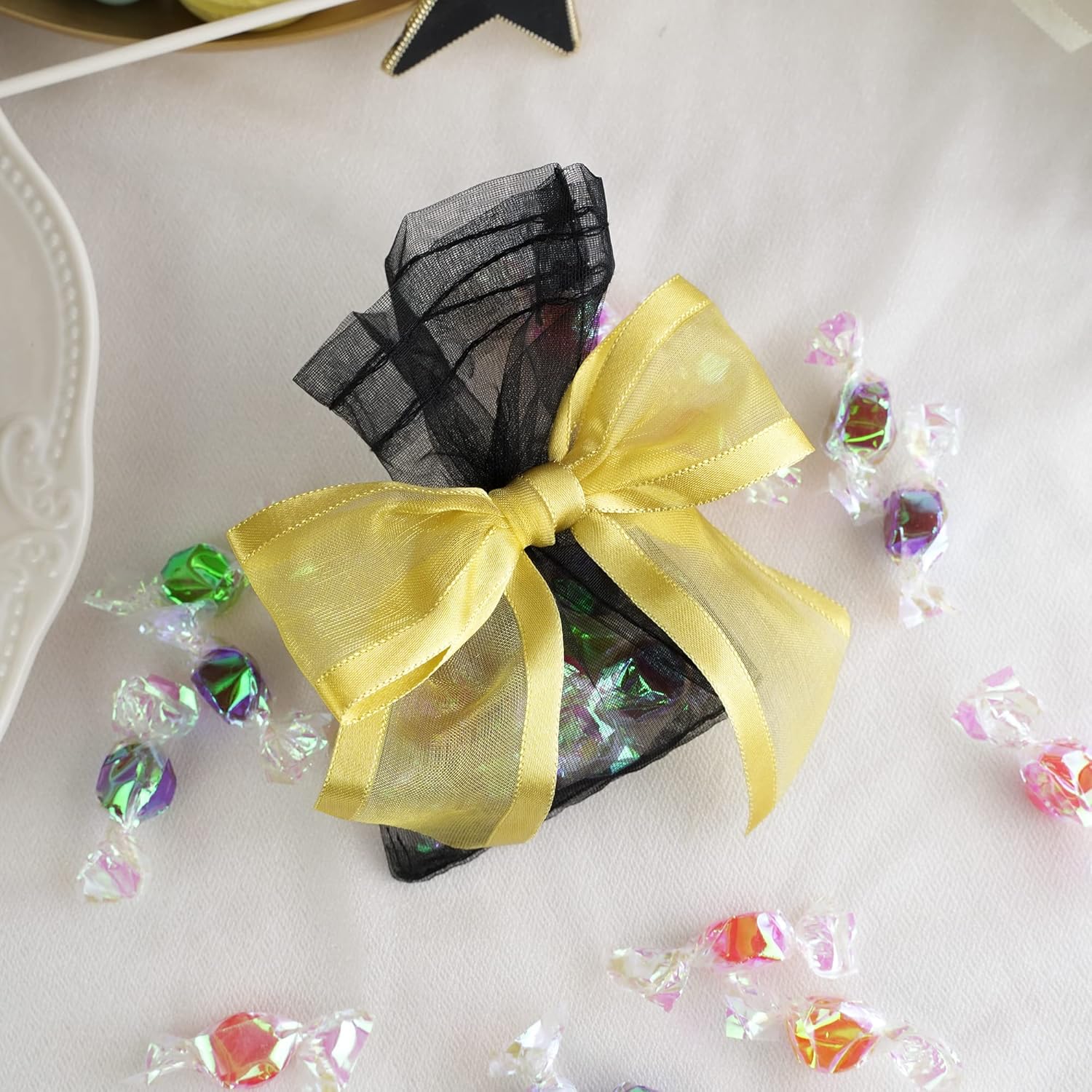 • PRETIED RIBBON BOWS- Decorative bows is made of 1-1/2'' gold organza satin edge ribbon with romantic transparency and glossy lustre, easily adding a elegant final touch to your party favor, cake pop bags, gift basket