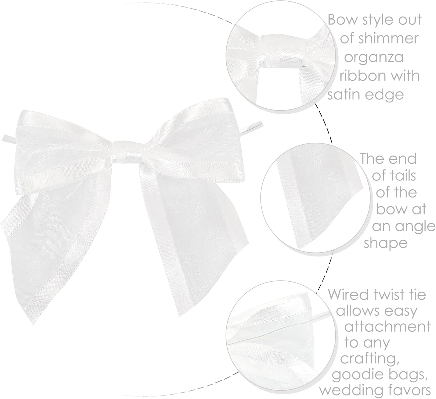 • PREMADE BOWS WITH TWIST TIES- White ribbon bows is ready tied and made with a 5'' clear twist tie on the back, easy to use and remove, ready for tying up gift, treats, baskets, wreaths and anything in a bag you can tie