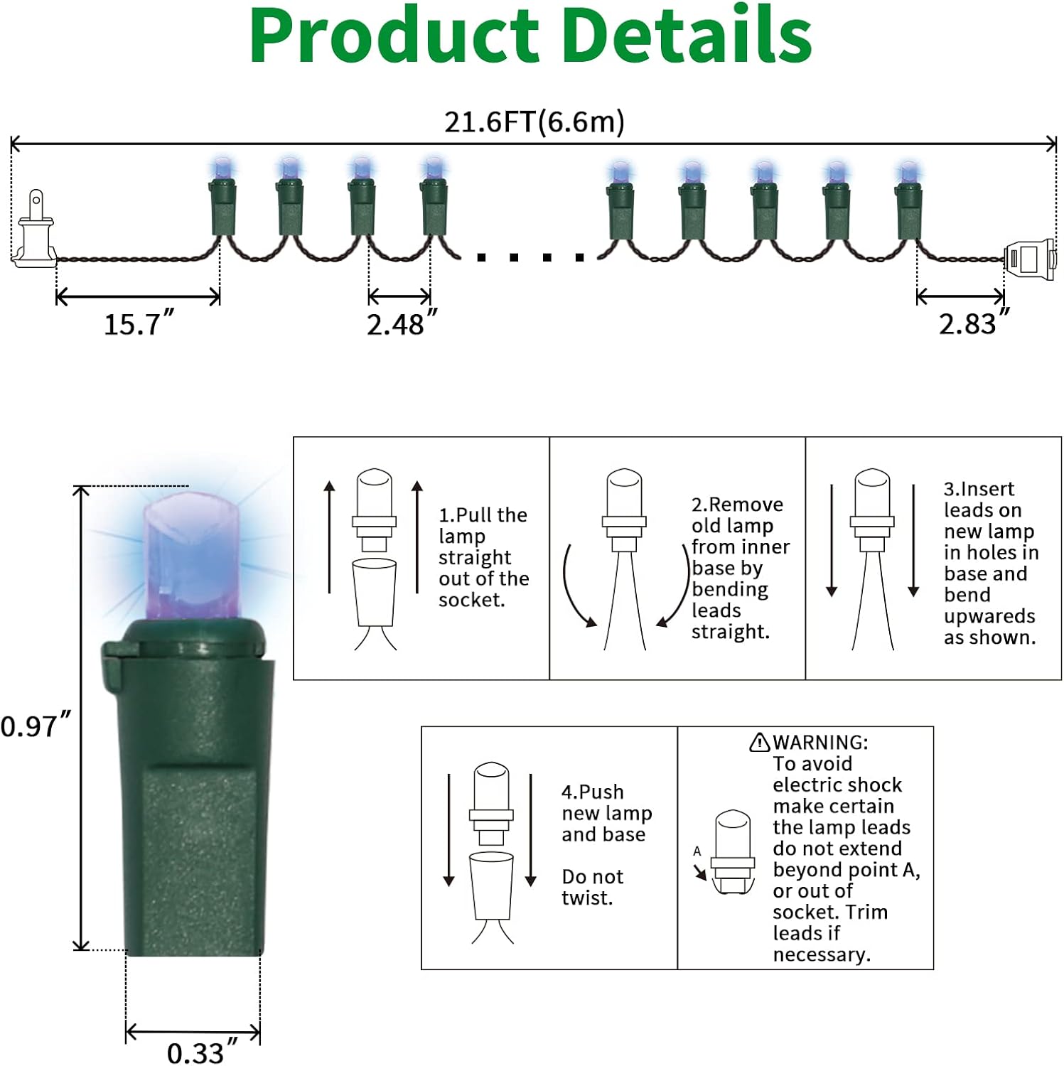 • 5mm LED Christmas Lights: 100 counts warm white 5mm wide angle stable LED string lights spaced 6.3 inches apart with green wire. 7.1 inch leads have a stackable male plug and 5.9 inch tails have a female plug for easy end to end connection.