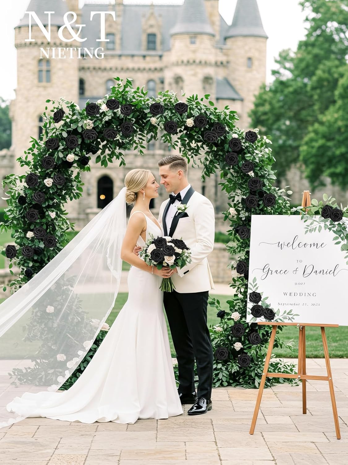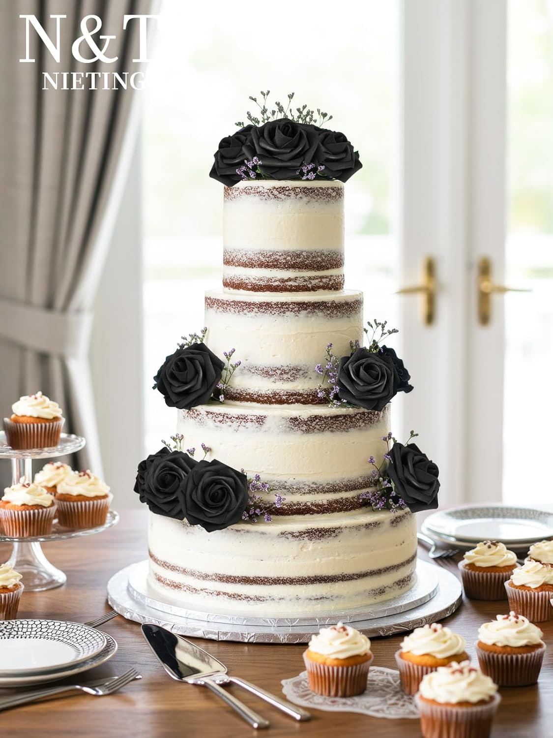 N&T NIETING Artificial Flowers Black Rose 50pcs Real Touch Flowers Perfect for for DIY Bouquets Wedding Party Baby Shower Home Decoration