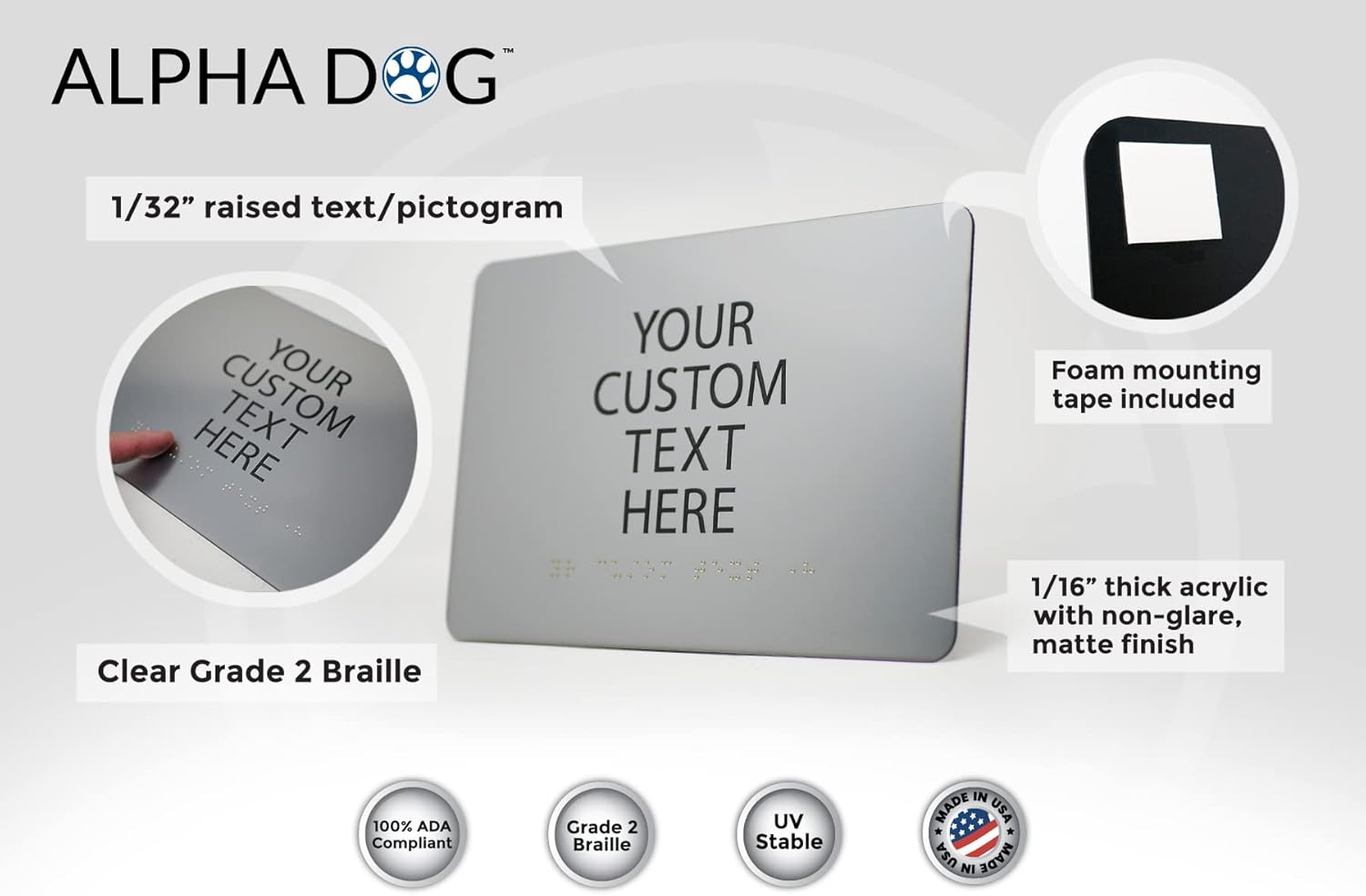 ALPHA DOG ADA SIGNS Custom ADA Compliant Braille Sign, 6"x9" Room Identification Plaque, Tactile Text, Raised Letters, Personalized 4-Line, Indoor/Outdoor, USA-Made (Brushed Stainless)