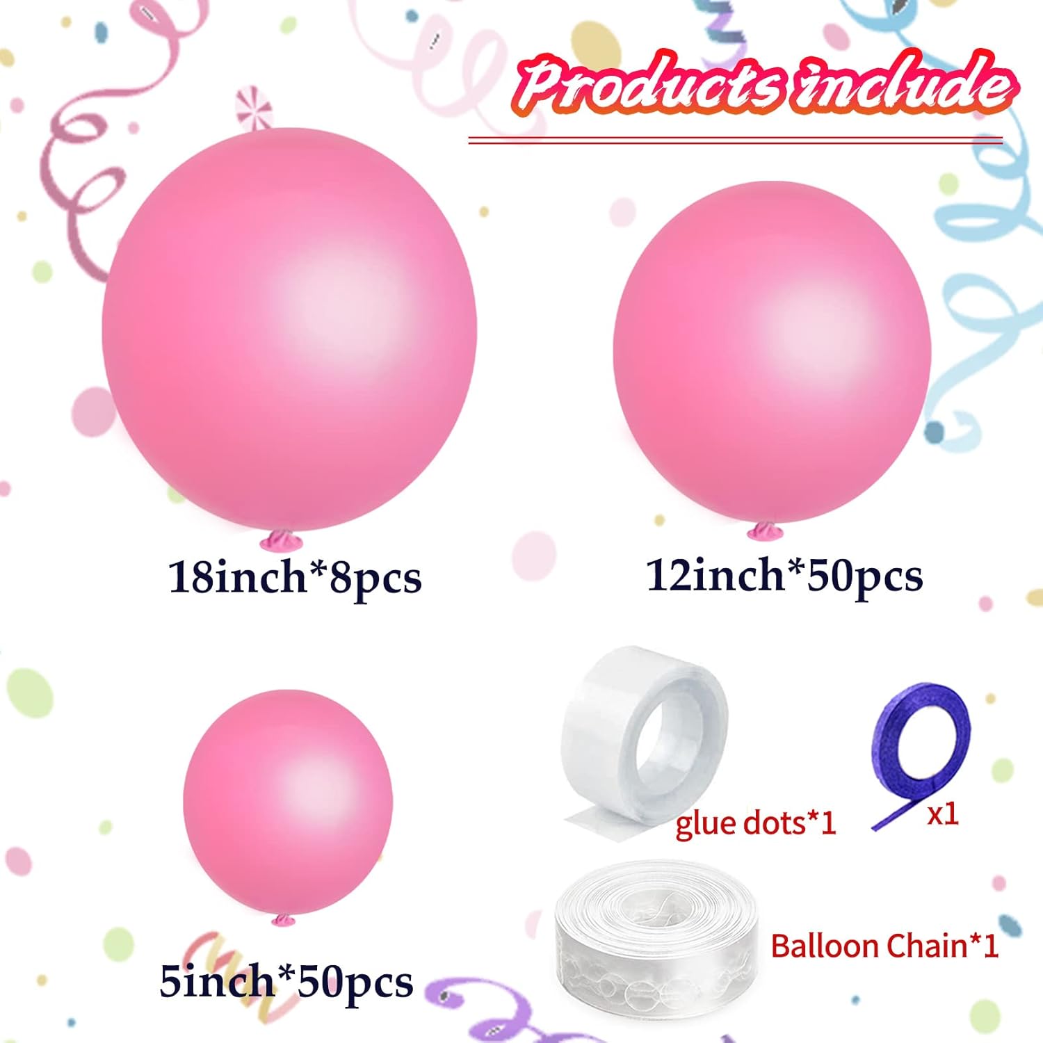 • Pink balloon garland kit: 111Pcs Pink balloons pack, including 8 pcs 18 inch balloons, 50 pcs 12 inch balloons, 50 pcs 5 inch balloons, a 5 meter balloon chain, 100 dots of glue dots, a roll of ribbon.