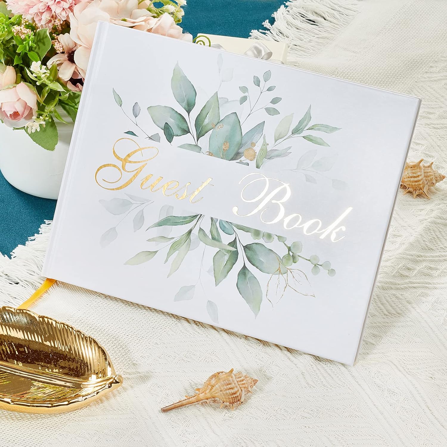 TRULIVA Wedding Guest Book with Pen - Sign in Book for Wedding Reception - Gold Foil - Hard Cover, 7" x 9" (Eucalyptus Gold Foil, Book and Pen)