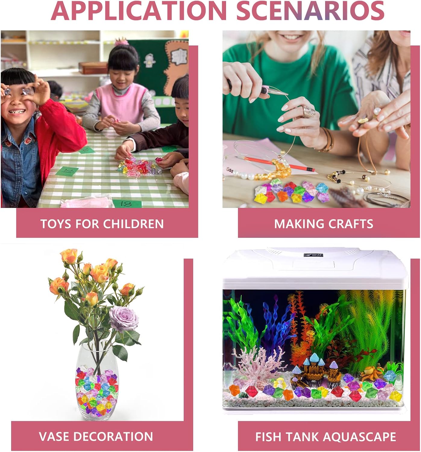 • Widely in use: Our fake crushed ice can be widely used in Vase Fillers, Table Scatter, Party Favor, Wedding Decoration, Photography Props, Food Display, Fish Tank Decorations, DIY Arts & Crafts, etc.