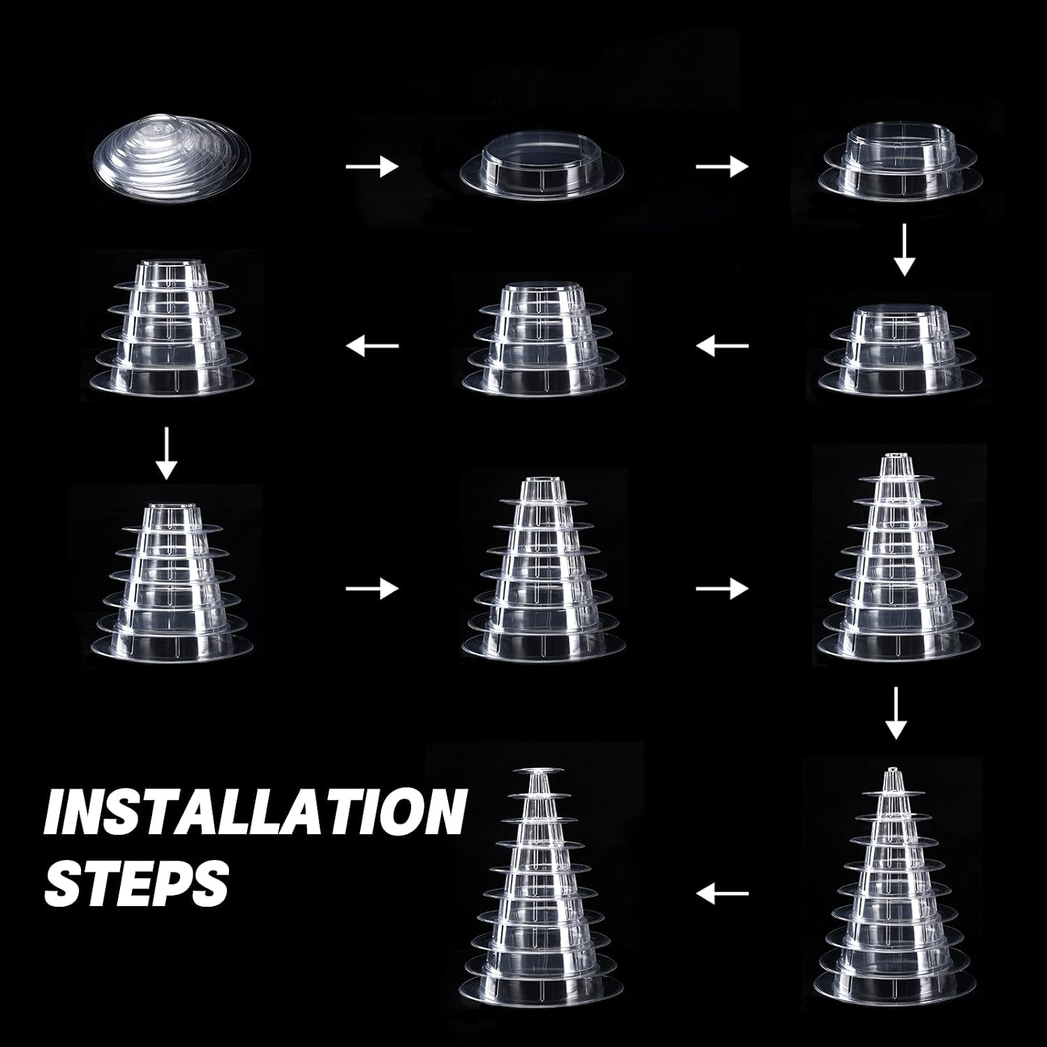 • 【10 Tiers Adjustable Tower】: The stackable cake stand can be used with just 2 or up to 10 tiers, can holds approximately 200-250 macaroons (Depending on each macaroon size). Plastic cake display stand can also show your cupcakes, desserts, cookies, donuts, fruits to your friends or families.