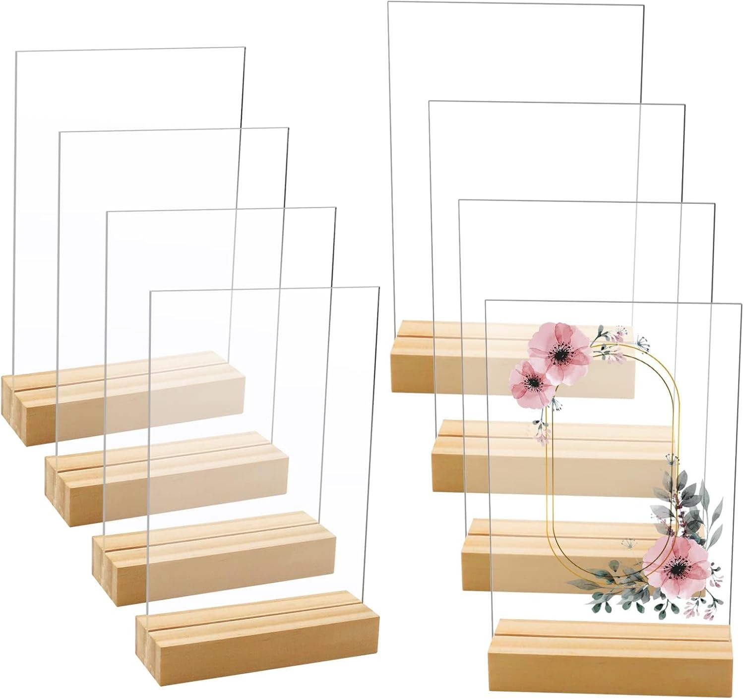 8 Pack 5 x 7 Inch Blank Clear Acrylic Table Displays with Wooden Stands - Ideal for DIY Name Cards, Menu Numbers, and Event Party Decorations(SINGLE LAYER)