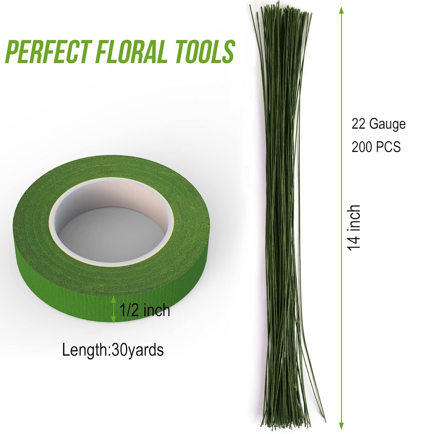 • Great value: This floral tool kit includes 3 rolls of 1/2-inch wide floral tape (30 yards/roll) in dark, medium, and light green, plus 200 pcs 14-inch 22-gauge flexible dark green floral wire. Note: Lower gauge numbers indicate thicker wire