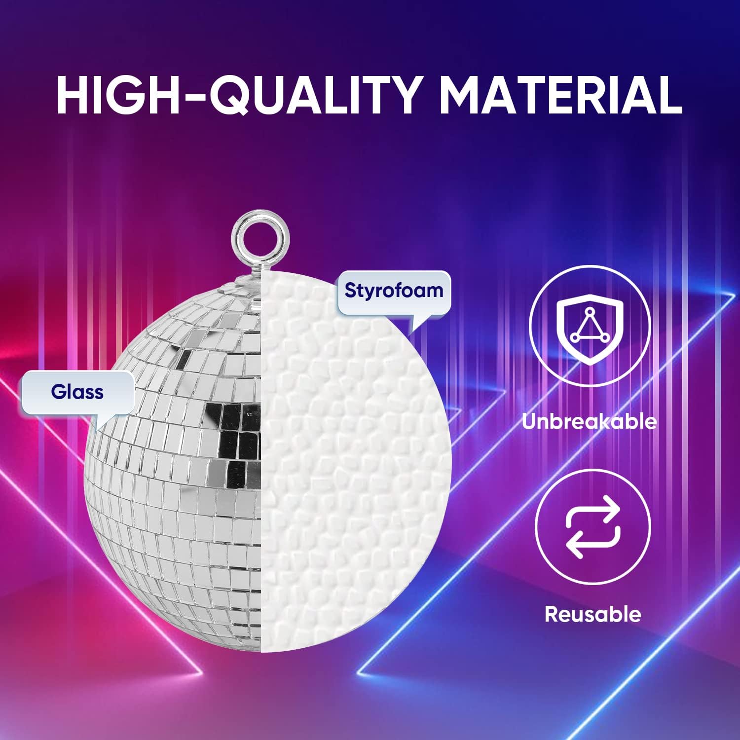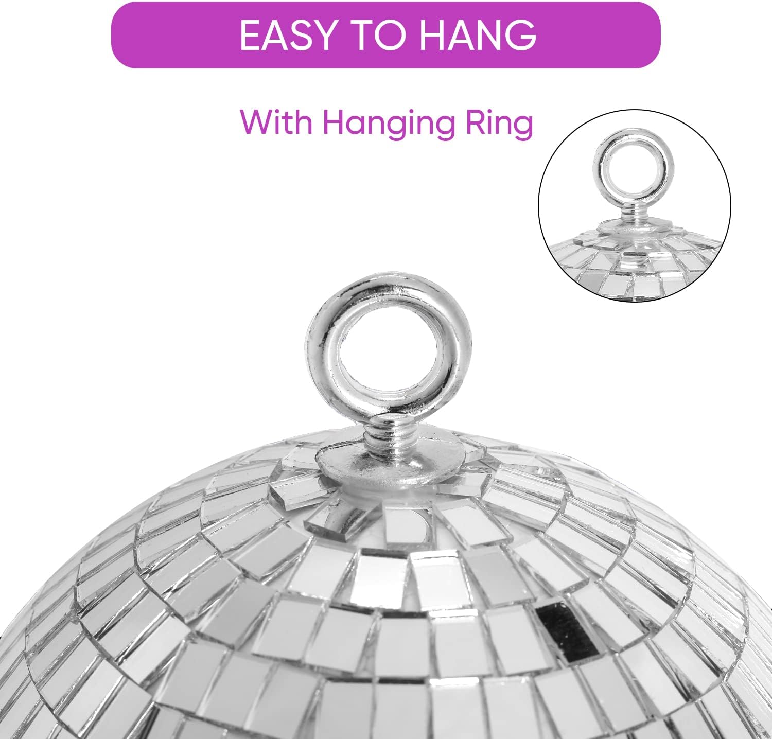 • Premium Silver Mirror Ball: 6 inch disco mirror ball is well-constructed with foam inner ball covered by solid glasses tiles for a shiny lighting effects, which can secure mirror on the right place without moving, lightweight and easy to install