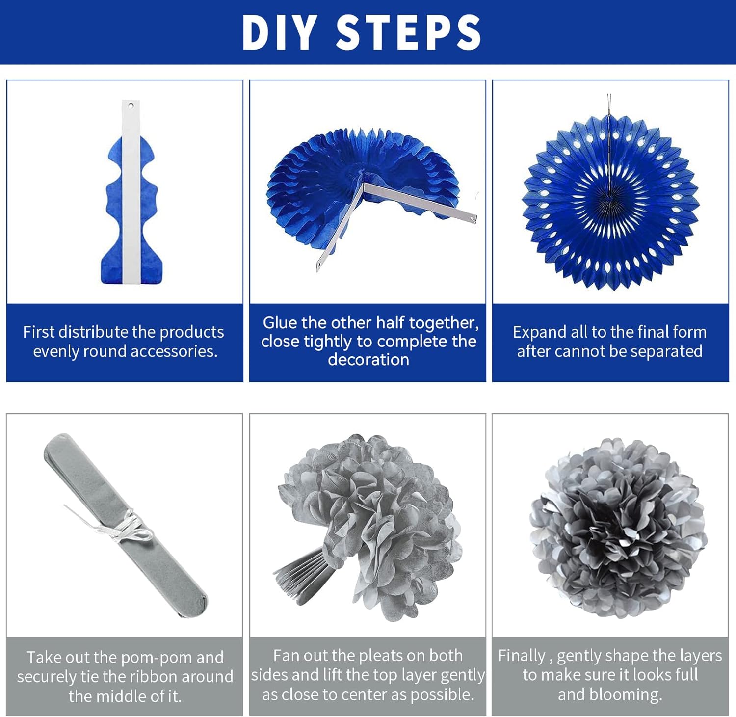 Blue and Sliver Party Decorations, 23Pcs Blue Birthday Decorations with Hanging Paper Fans, Pom Poms Flowers Packs for Graduation Party,Boy Birthday, Baby Shower
