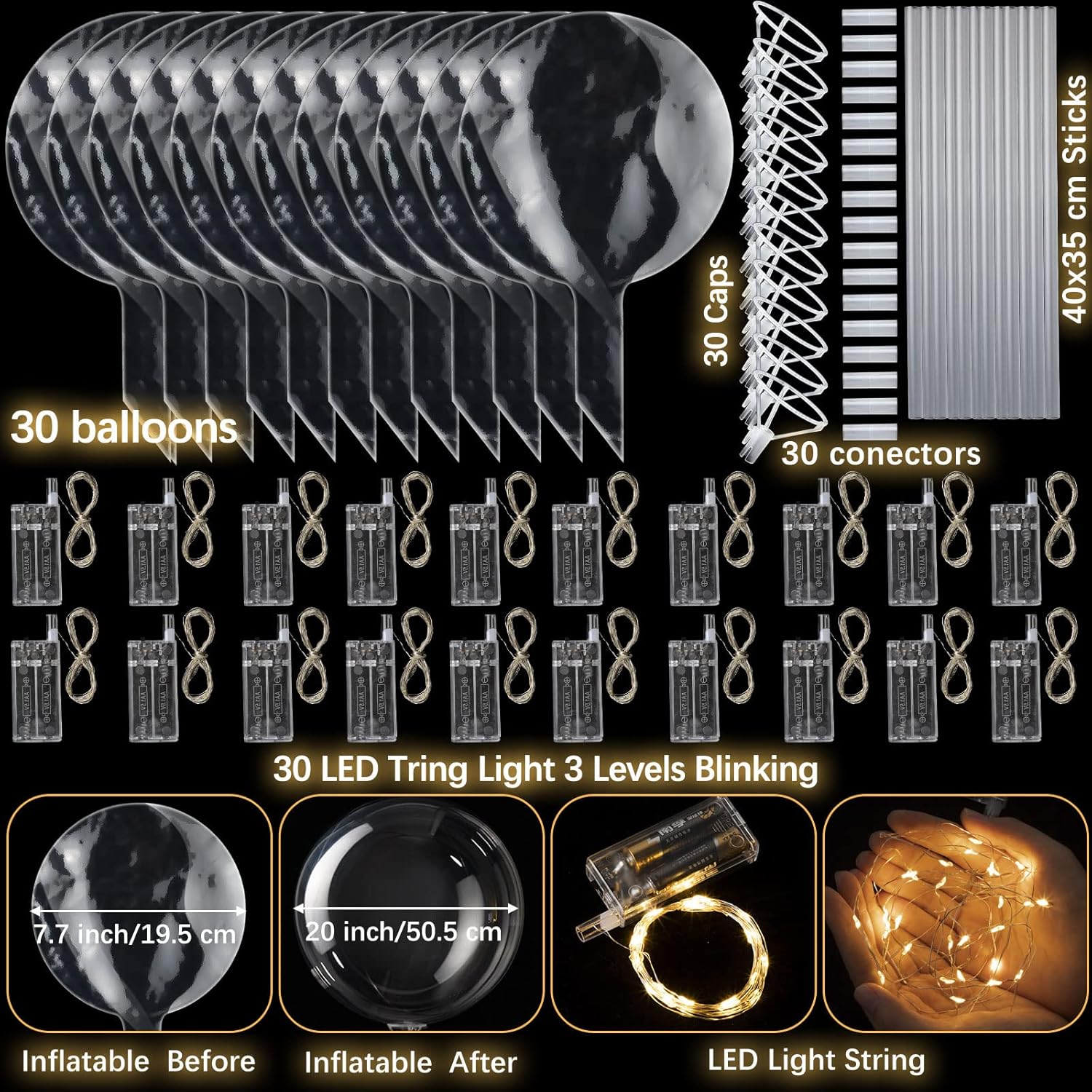 • Package Included: 30 pieces glow bobo balloons, 30 pieces led strings light (118 inch/ 3 meter for each), 60 pieces sticks (13.8 inch/ 35cm), a must have for a touch of fun and glamour, the highlight of your parties