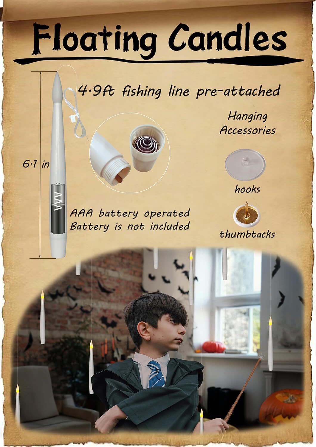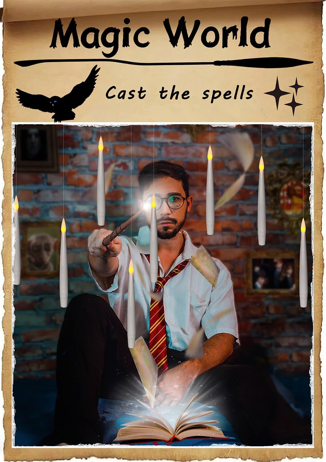 • Indoor decorations: The LED candle flickers with warm white light. You can hang these candles on the ceiling or chandelier to create "floating" candles effect for a Movie Theme party. They work great for dinner table, room, bedroom, classroom, nursery, birthday party, wedding. Also a perfect gift for Halloween Christmas and valentine's day.