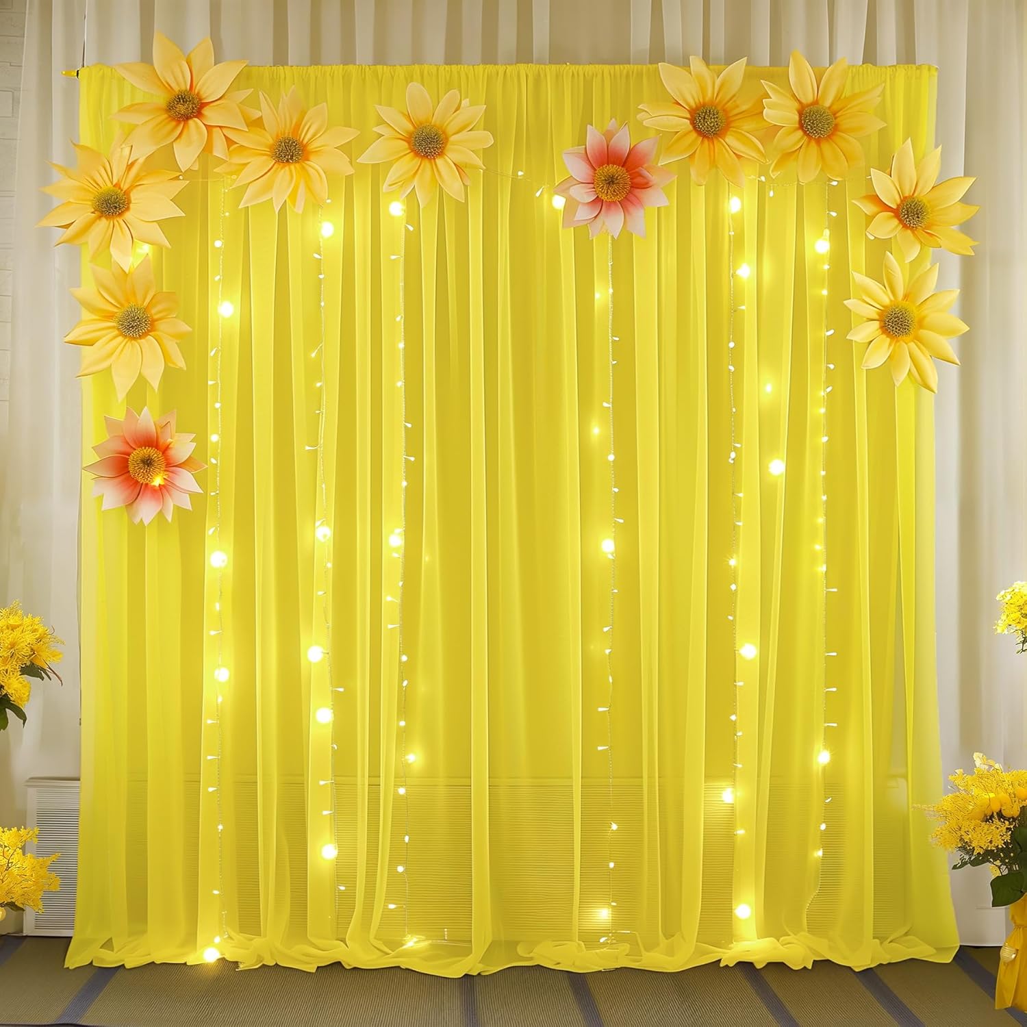 • Elegant Draping Fabric - The yellow backdrop drapes are made of premium quality glossy chiffon fabric,soft and durable. The sheerness is perfect for putting curtain lights behind them. Easy to get these sheer backdrop curtains crease and wrinkle free